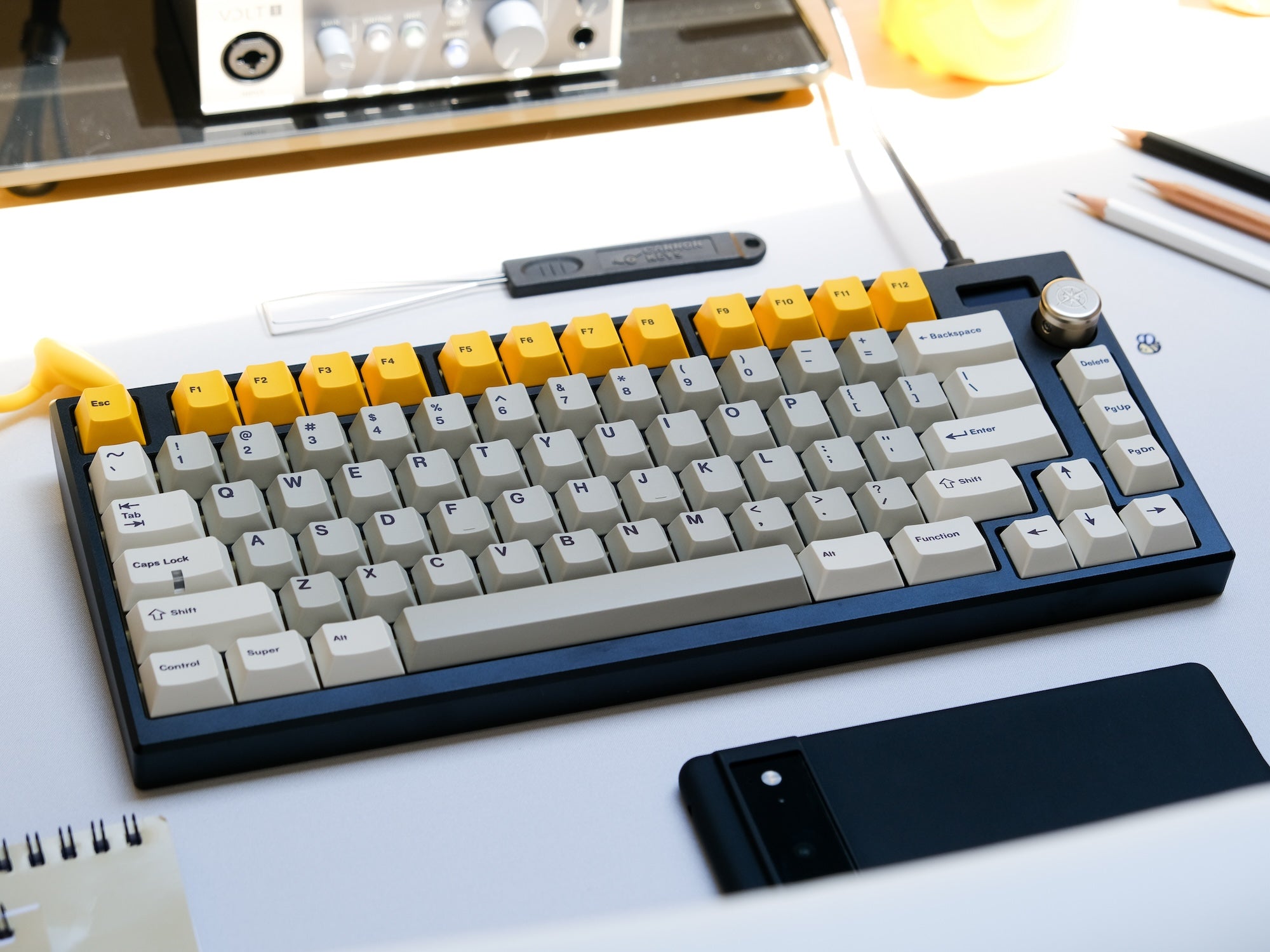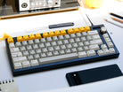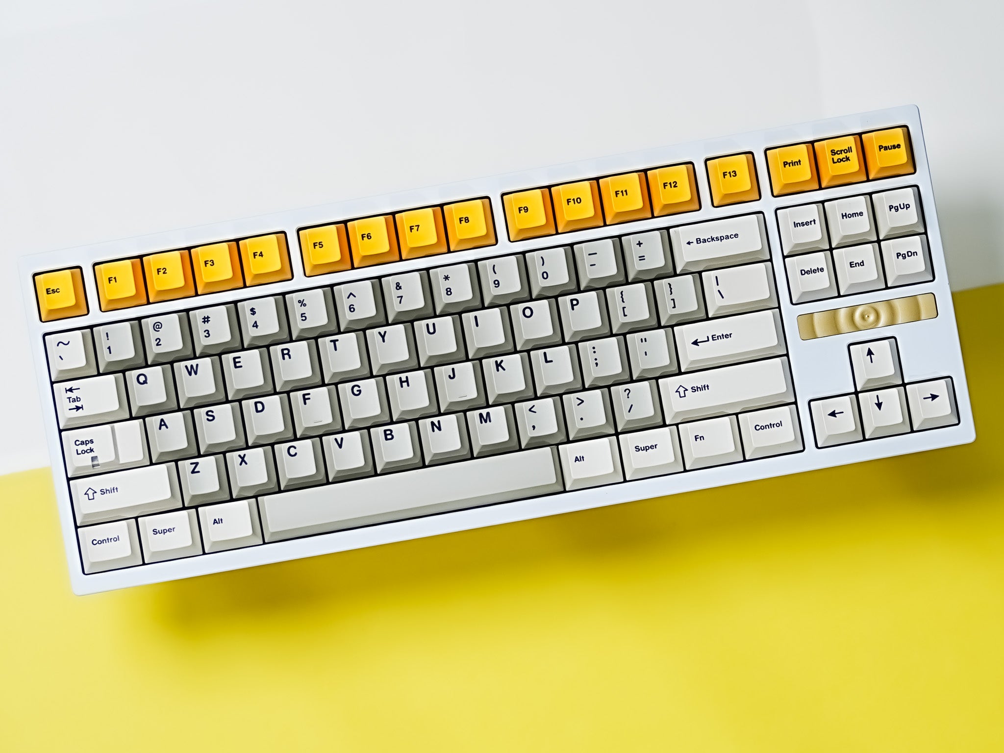 NicePBT R-Beige is like a standard beige set...but reversed. Designed by AKB, this set is a spin on the classic colorway, and includes a stunning yellow alternate F-Row. The kit even includes split spacebars, 40's support, and a second 'B' for all the Alice-style keyboards!