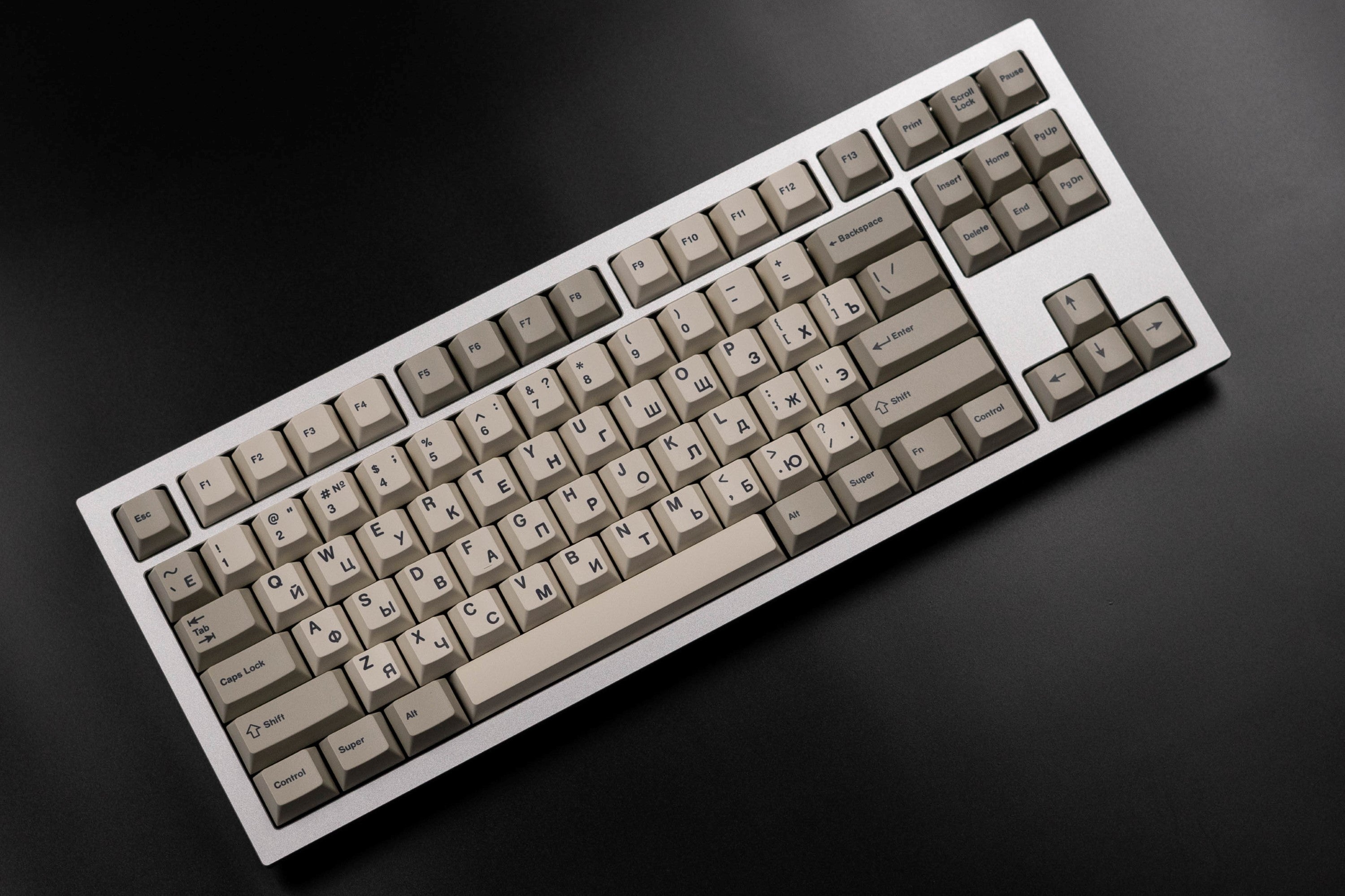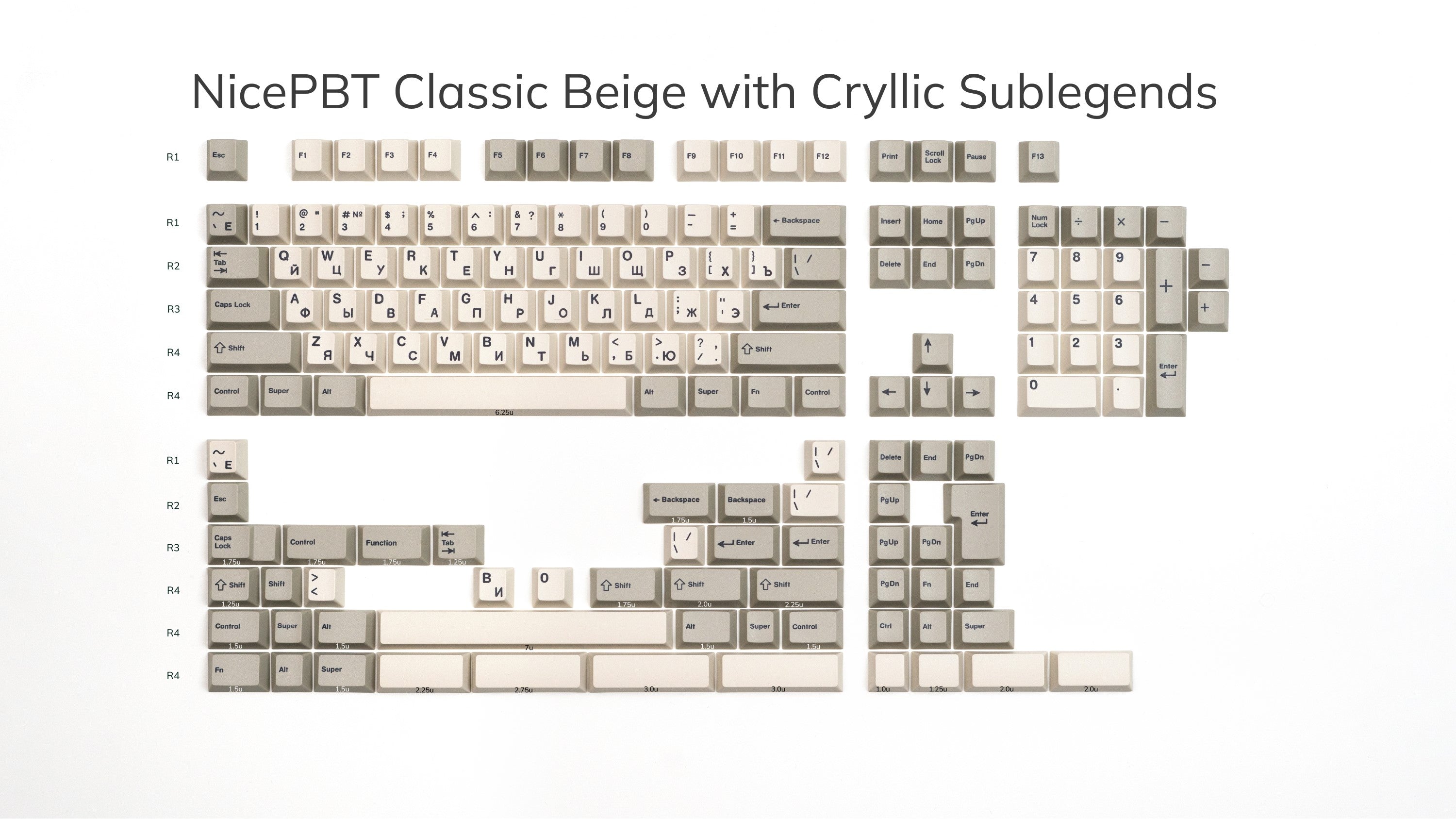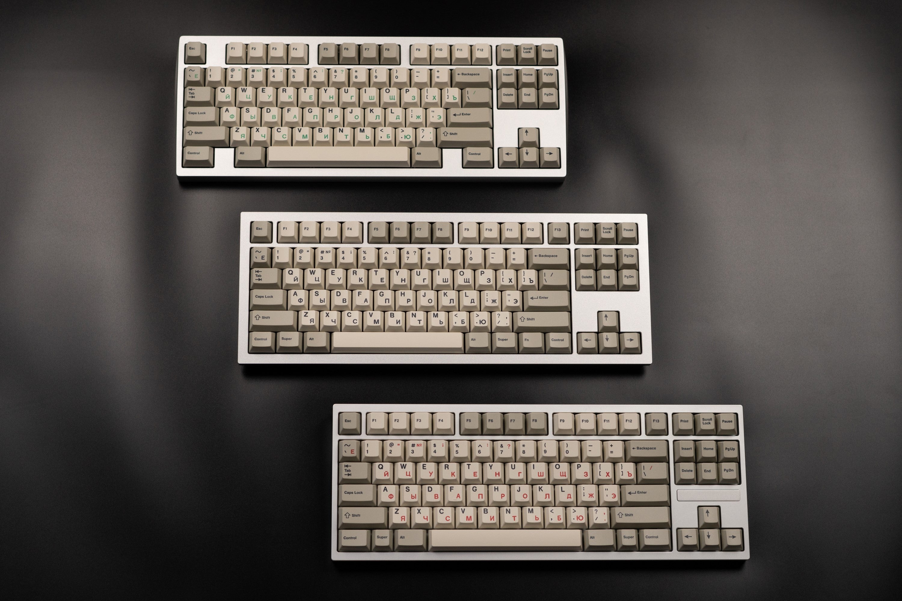 Our series of Classic Beige keycaps continues with the introduction of a new version utilizing revised text + icon mods and Cyrillic sublegends. This keyset comes in three varieties: Red Cyrillic, Green Cyrillic, and Black Cyrillic. Also included are a split spacebars, a second 'B' for all the Alice-style keyboards, and 4-key-40's support!
