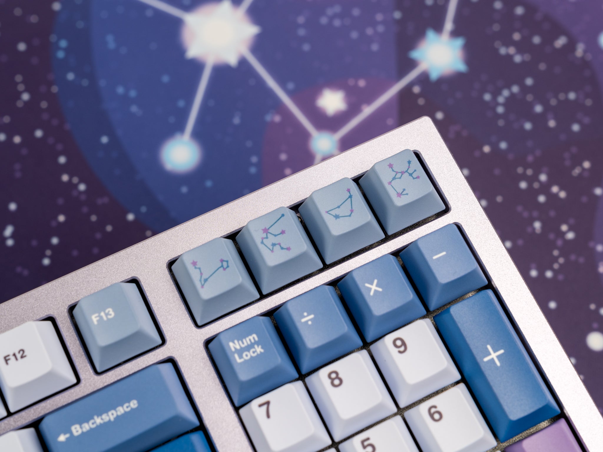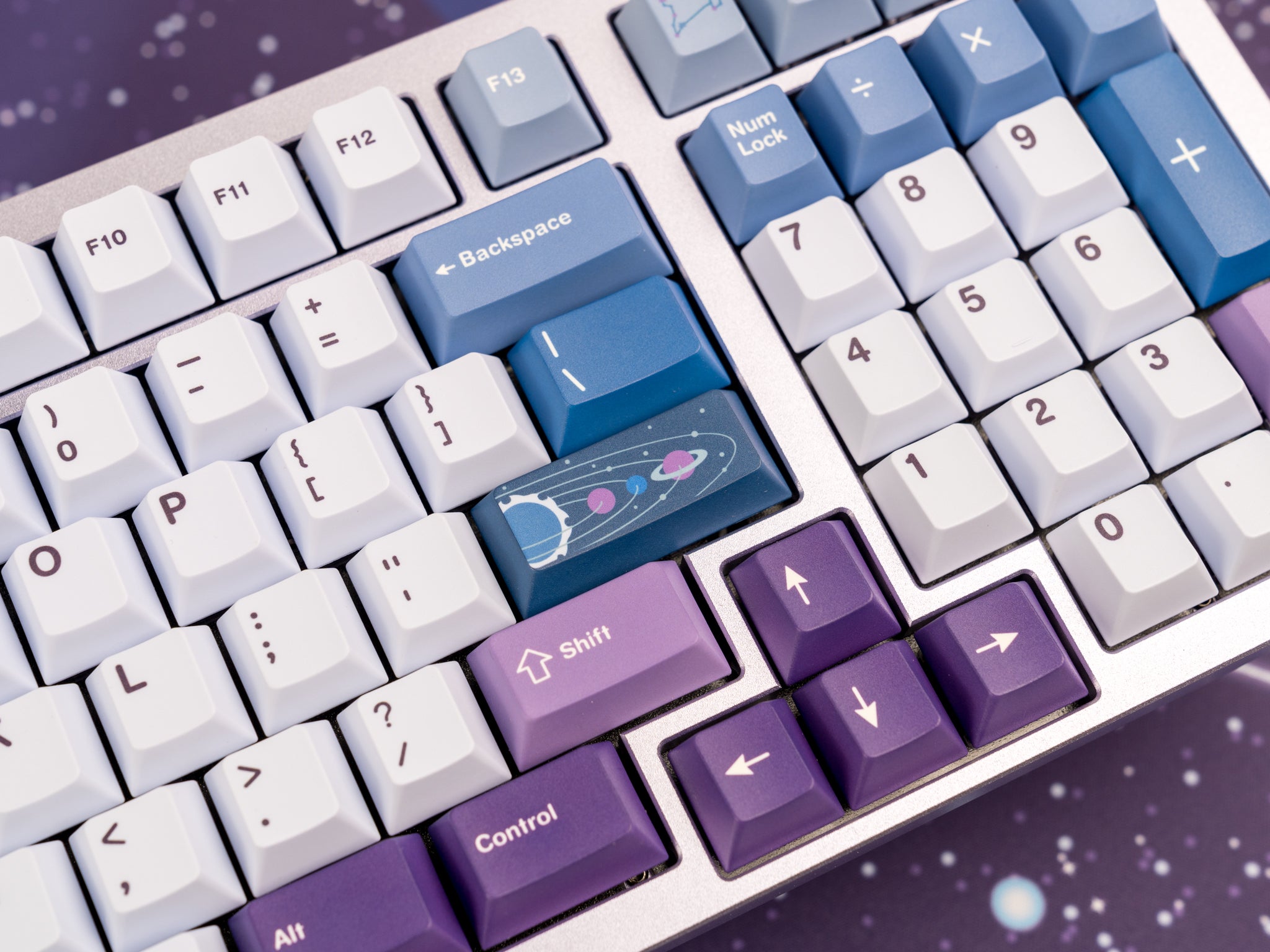 Take your keyboard on an interstellar adventure with NicePBT Galaxy! This set features a mix of purple, blue, and light blue alphas. Also included are space themed novelties to complete the look. The kit even includes split spacebars, a second 'B' for all the Alice-style keyboards, and robust 40's/ortho support.