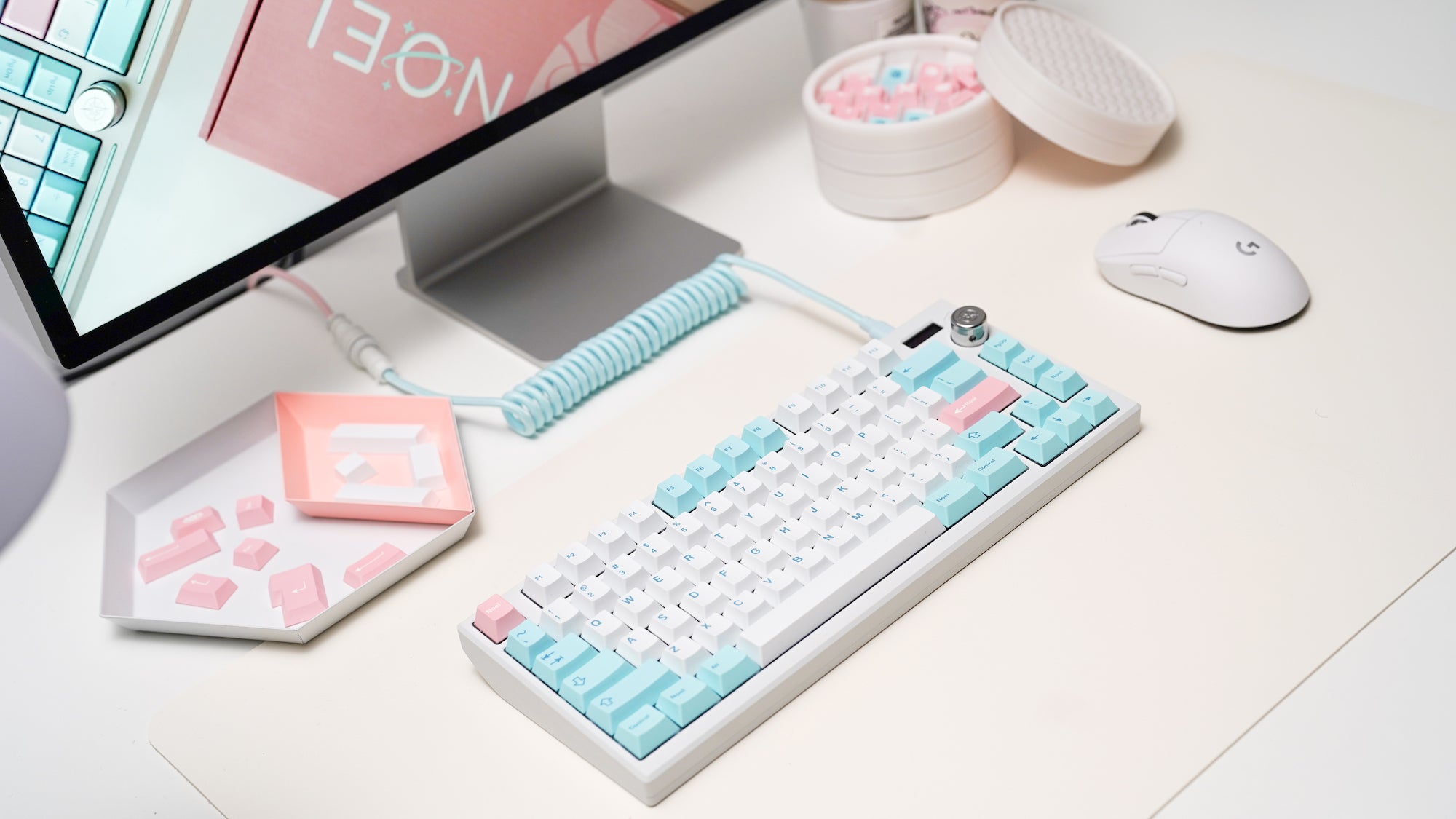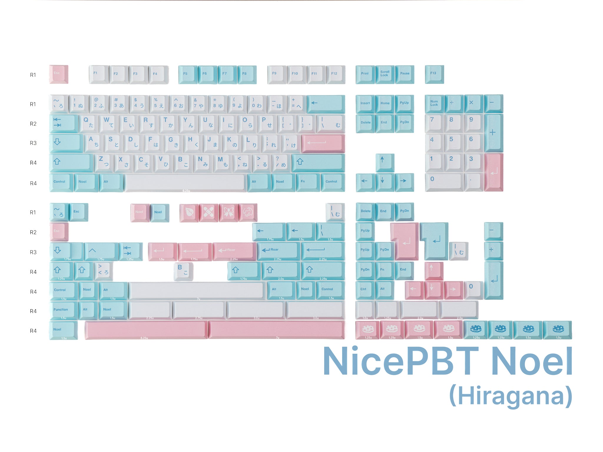 Taking heavy inspiration from pastel pinks and blues, this set features cute novelties and Hiragana sub legends to complete the otherworldly aesthetic. The kit even includes split spacebars, a second 'B' for all the Alice-style keyboards, and 3-key-40's support!