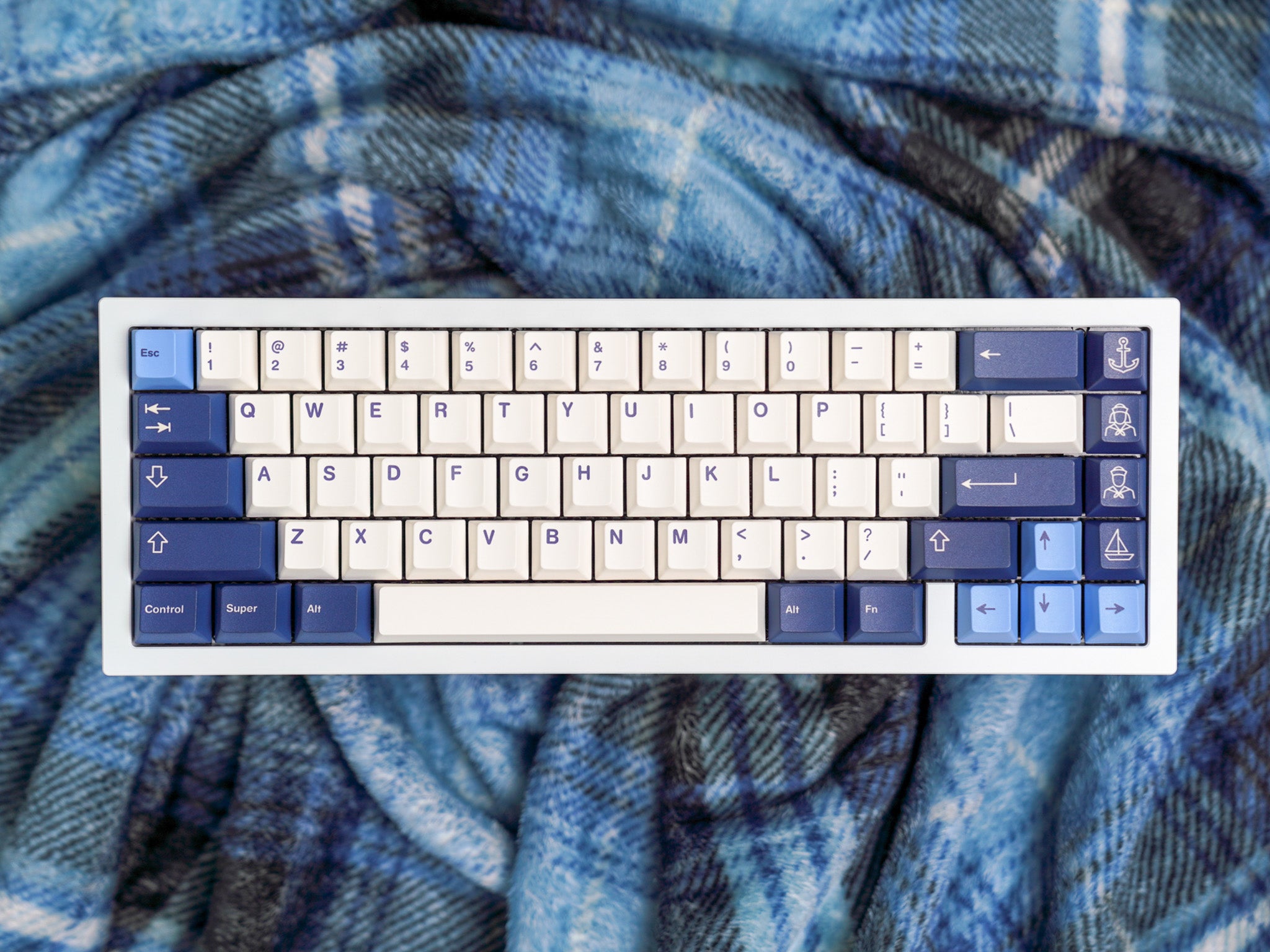 This newly revised version of NicePBT Sailor features our new text + icon legends and more layout support! This set features navy blue mods and light blue accents to complete the maritime theme. Also included are several novelty keycaps for your Esc Key, F-Row, Enter Key, and more! The kit even includes split spacebars, a second 'B' for all the Alice-style keyboards, and 3-key-40's support!