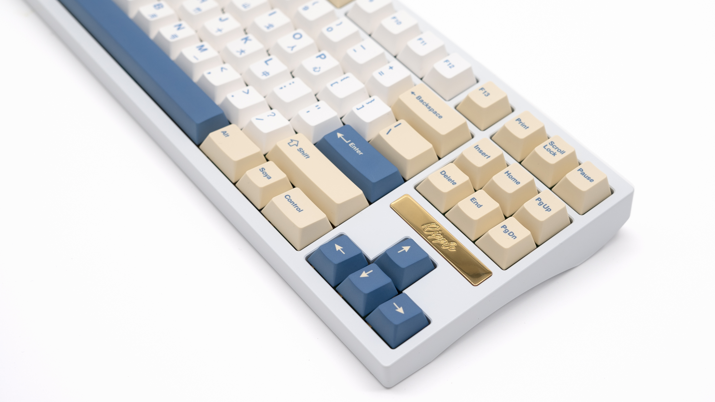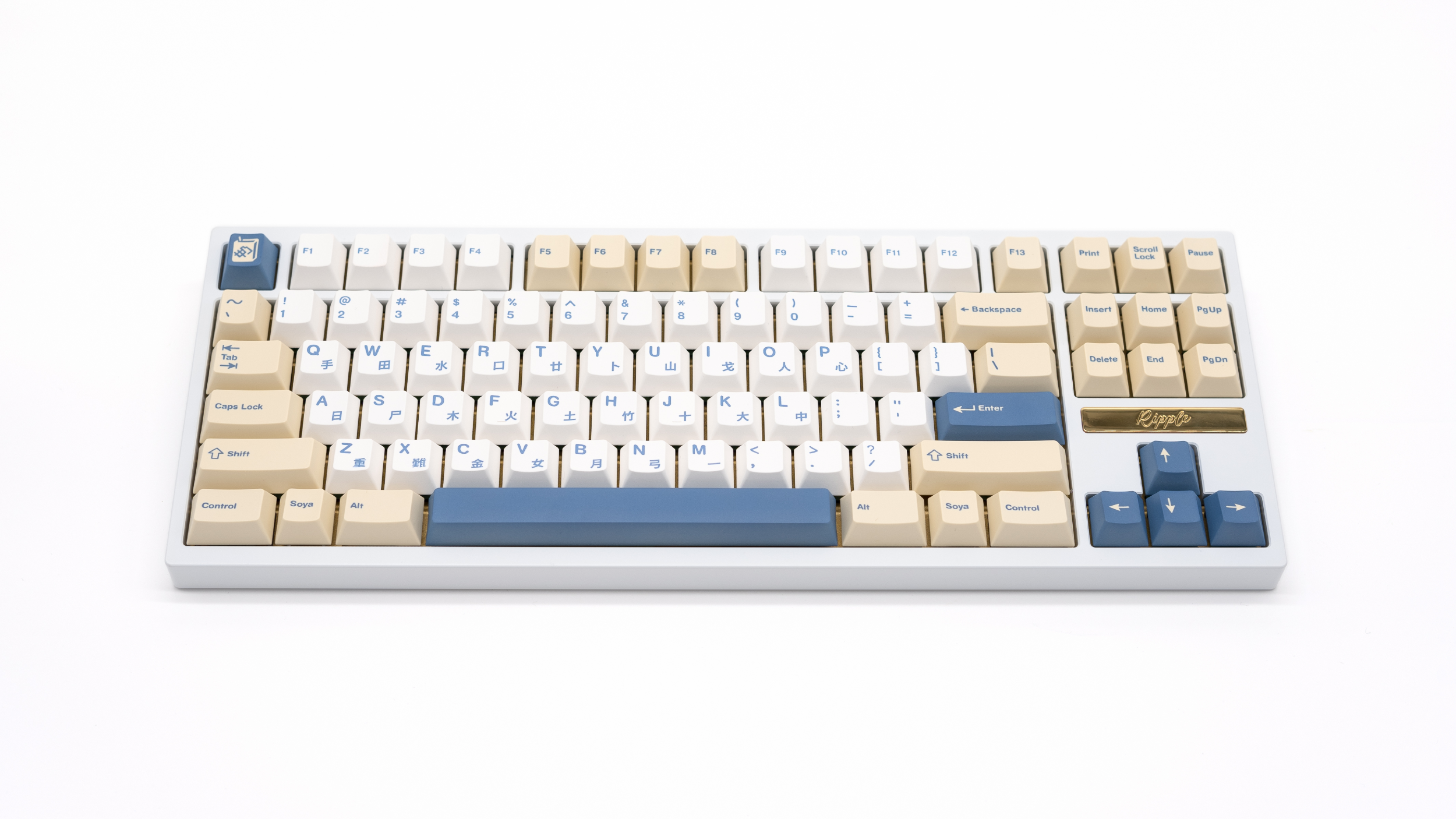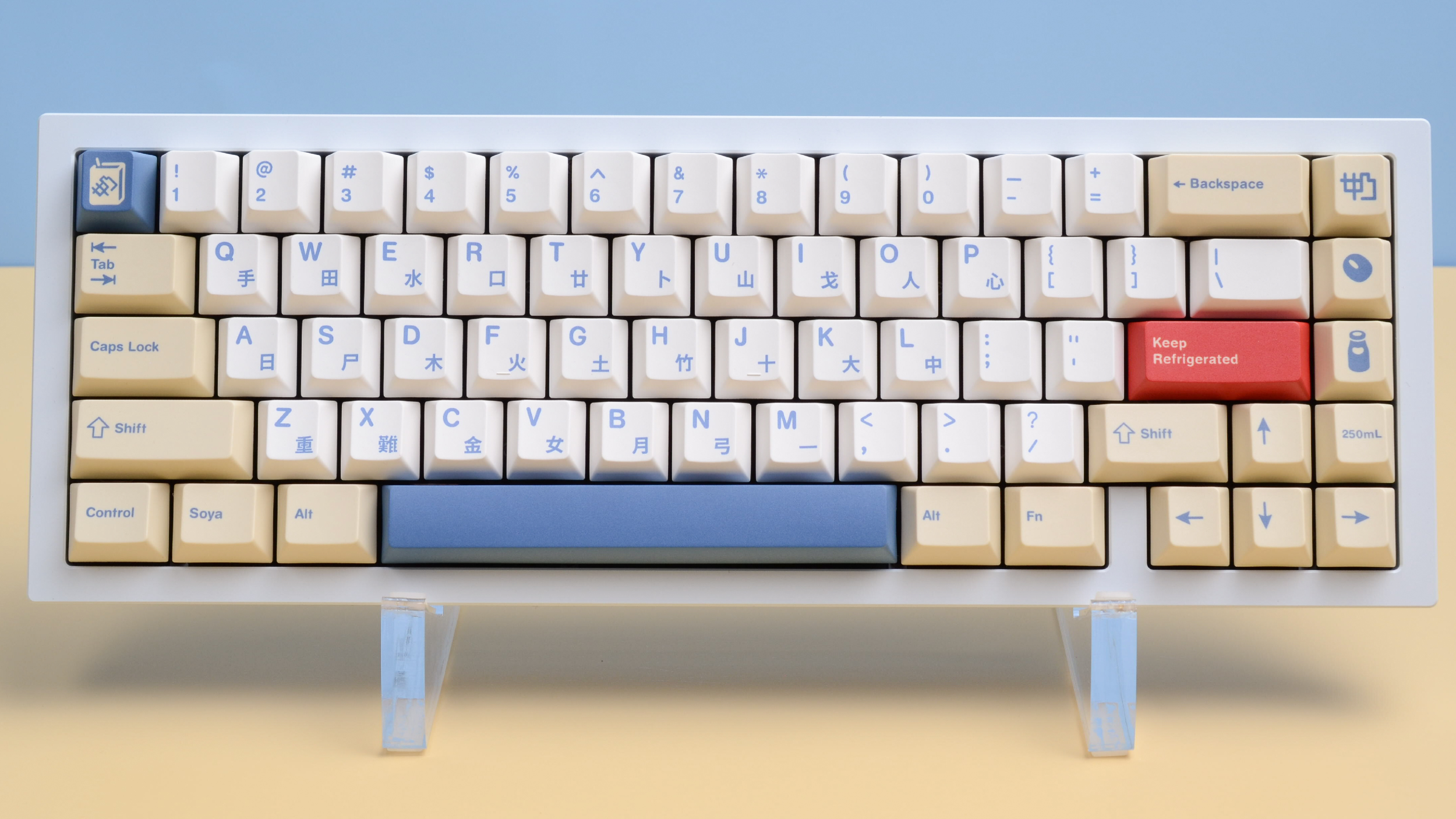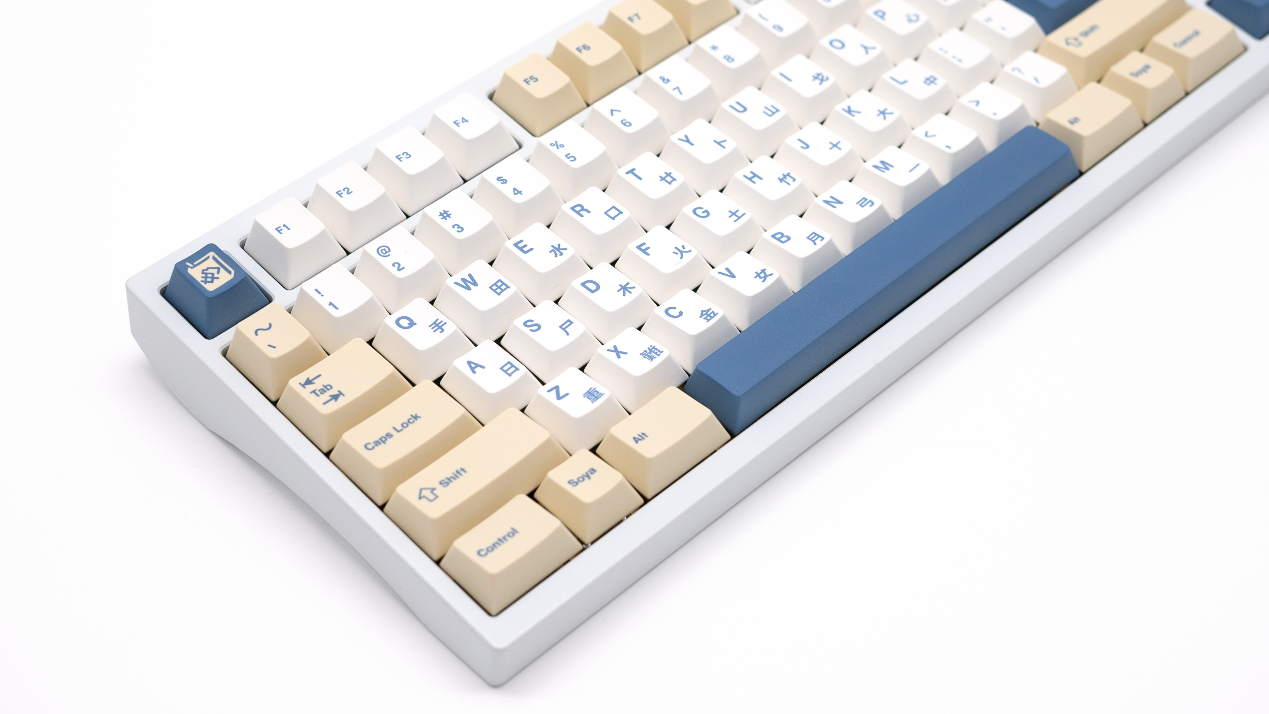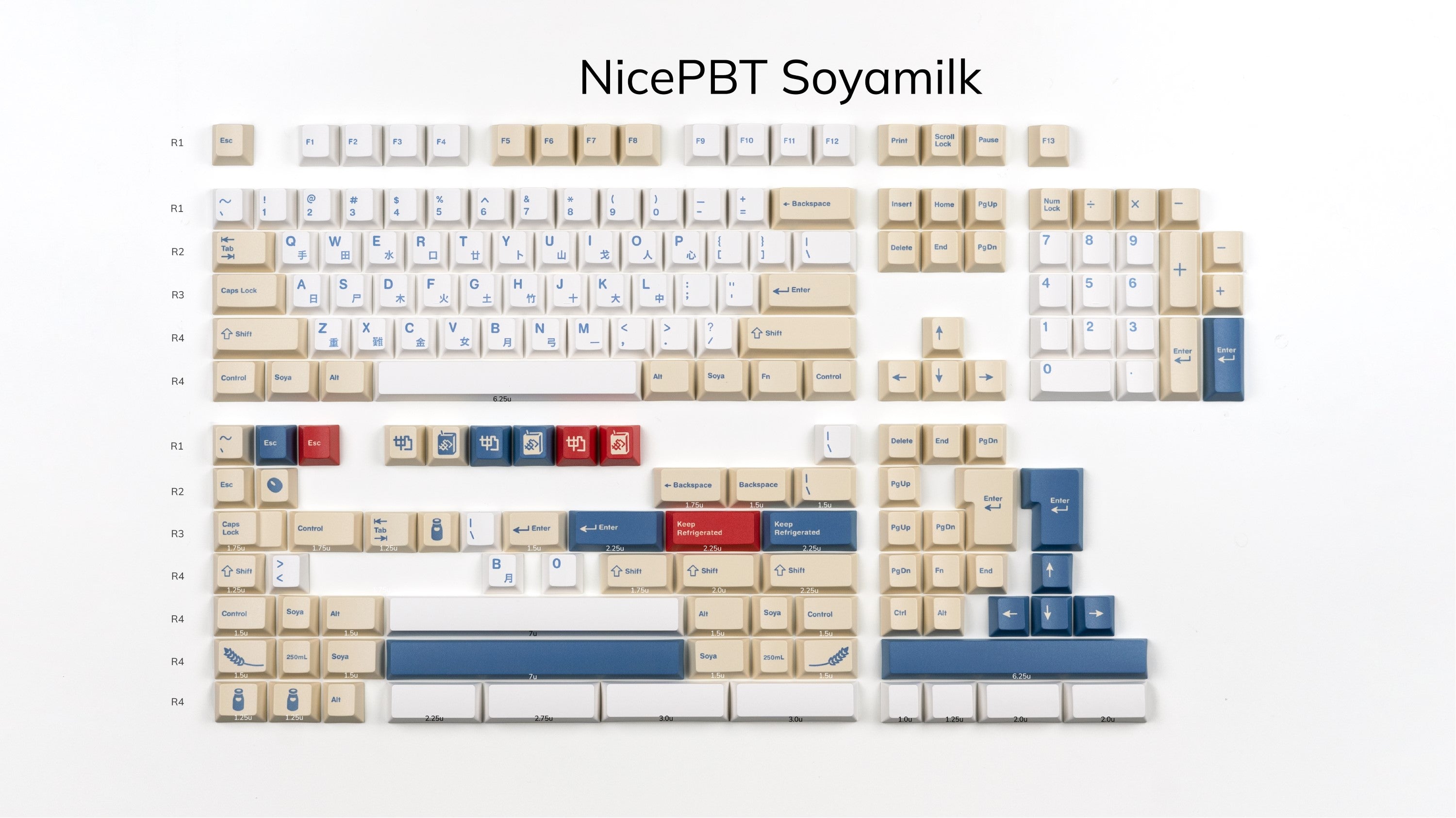 NicePBT Soyamilk is inspired by vintage soyamilk drink boxes, and is meant to instill nostalgia. The Cool blue on white alphas, beige mods, accents, and Cangjie sublegends combine to bring the vintage aesthetic together. The kit even includes split spacebars, a second 'B' for all the Alice-style keyboards, and and robust 40's/ortho support!