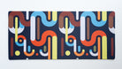 This deskmat features rounded retro inspired shapes on a dark blue background.