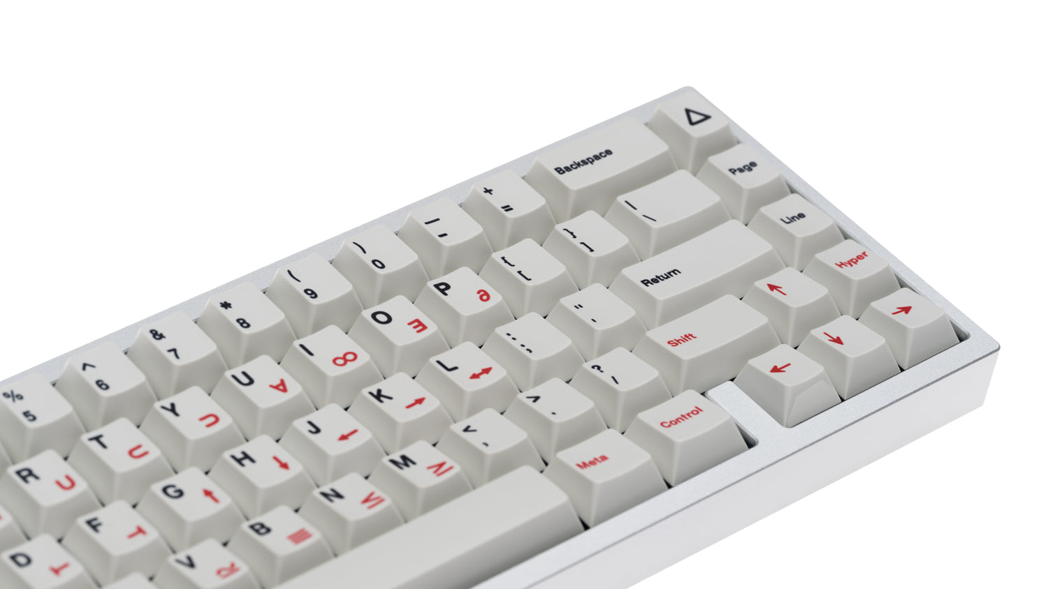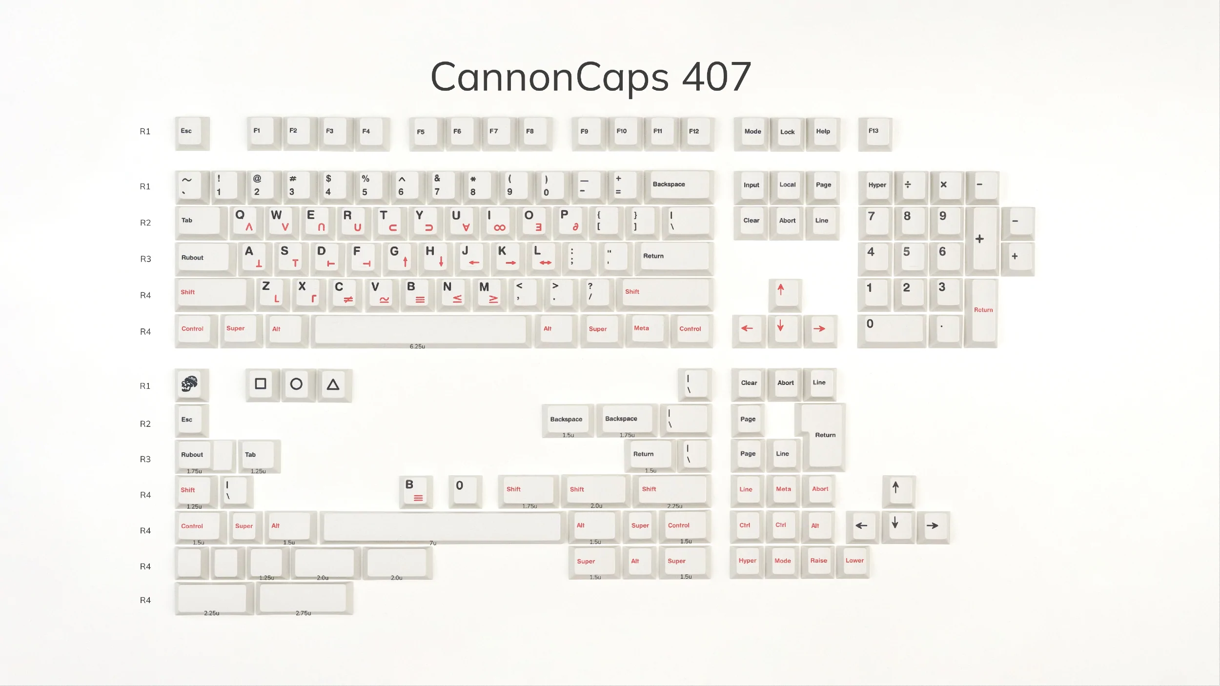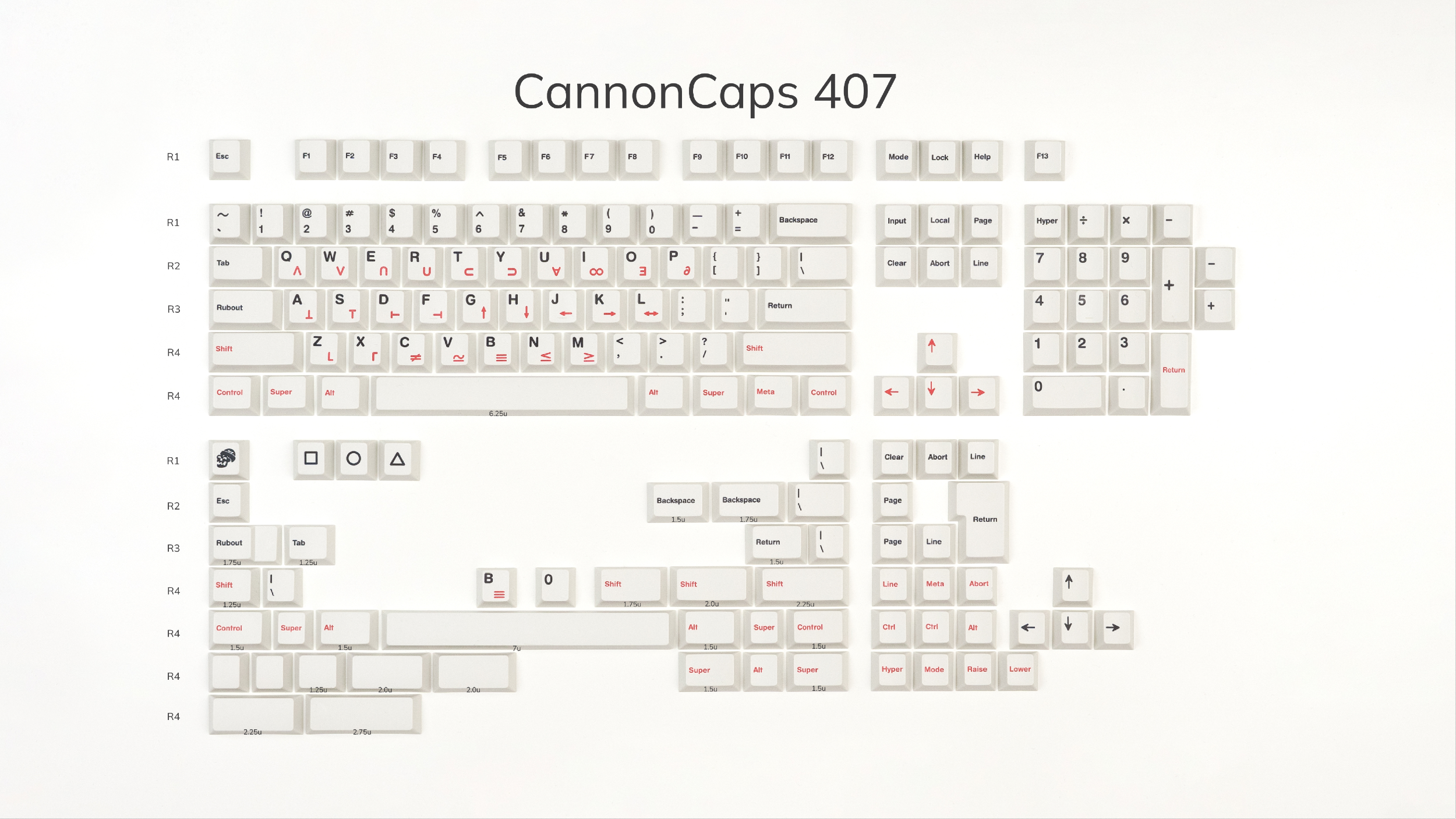 Taking inspiration from vintage Symbolics keyboards, CannonCaps 407 features black on cool gray alphas, red sublegends, and several novelty keycaps for a retro aesthetic. The kit even includes split spacebars, a second 'B' for all the Alice-style keyboards, and some extra 40's support!