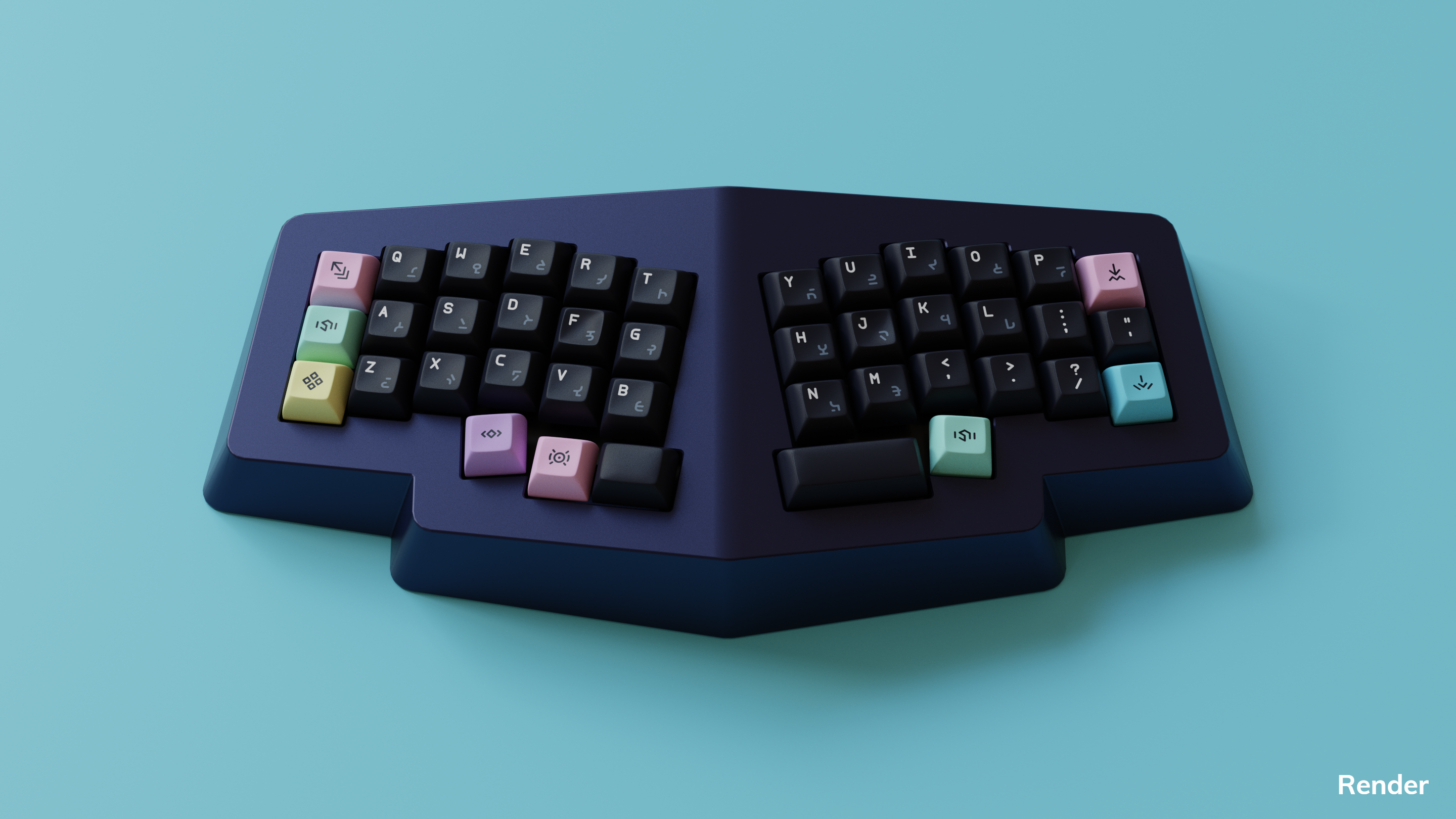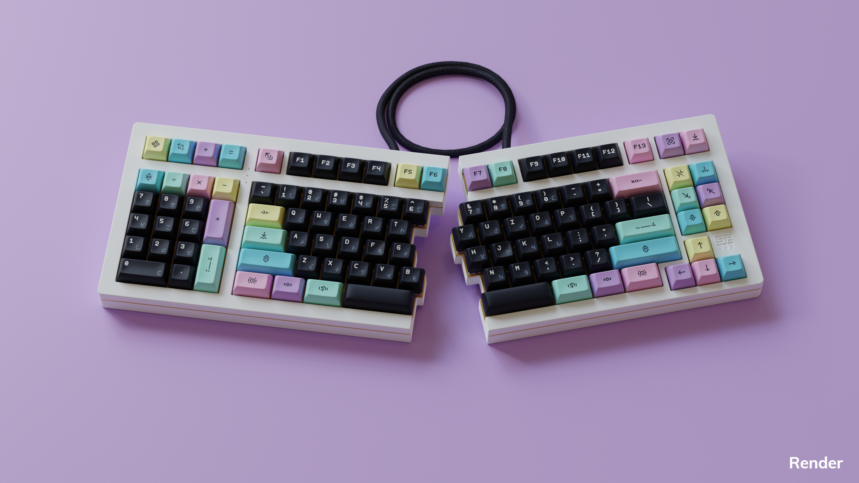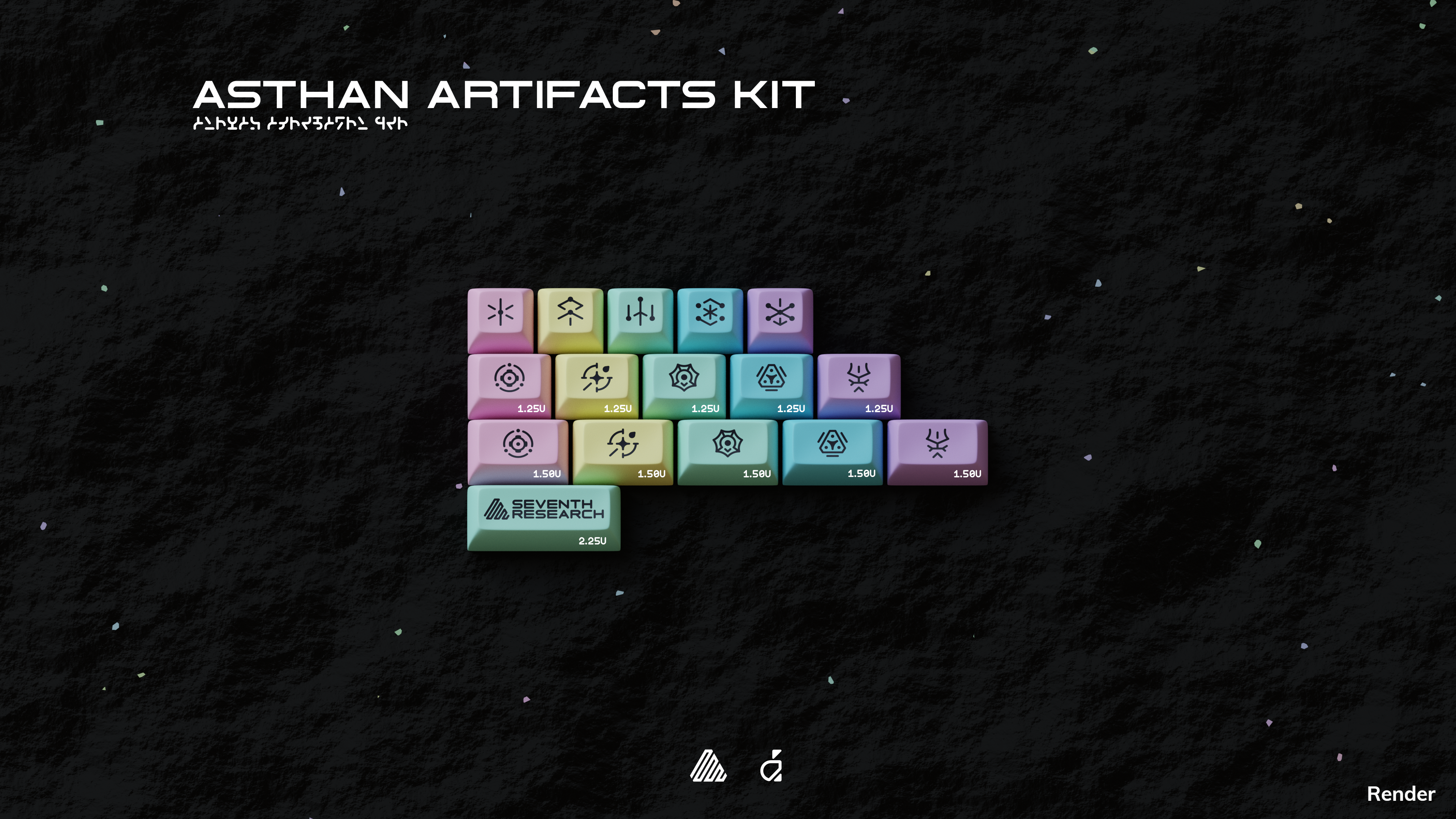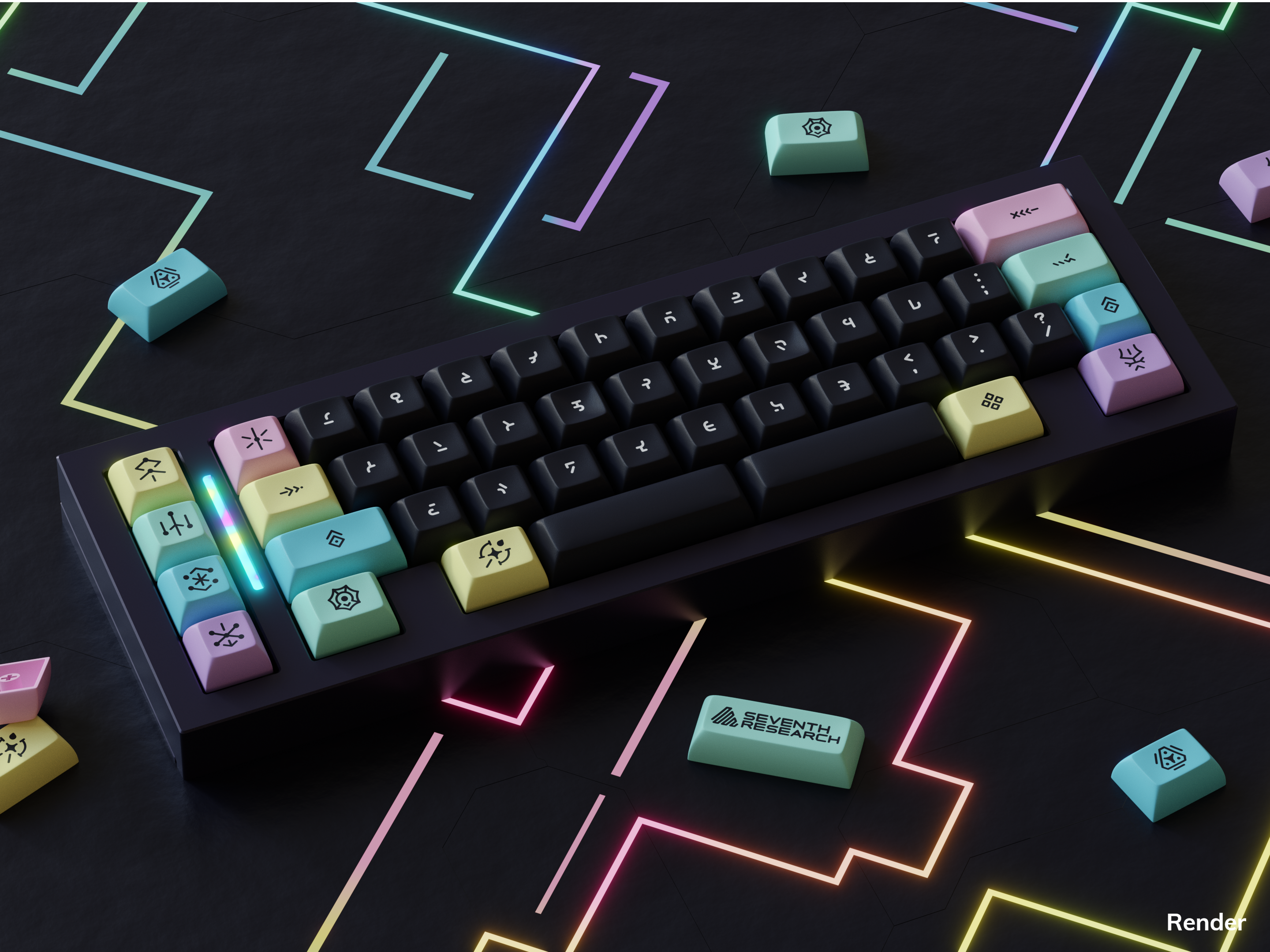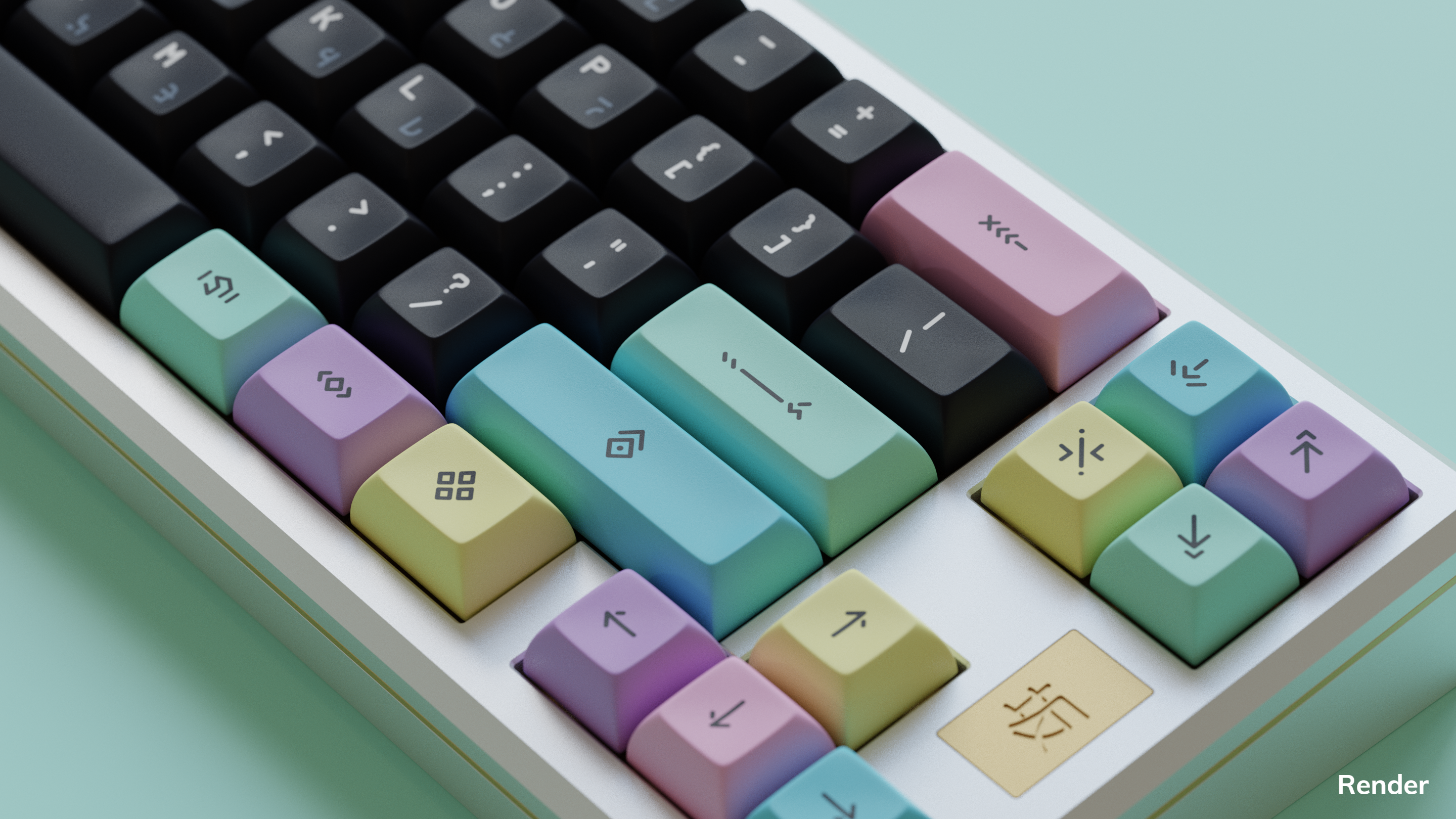 Designed by Dazon, this uniform profile keycap set features a modern pastel palette seamlessly integrated with cosmic sublegends.