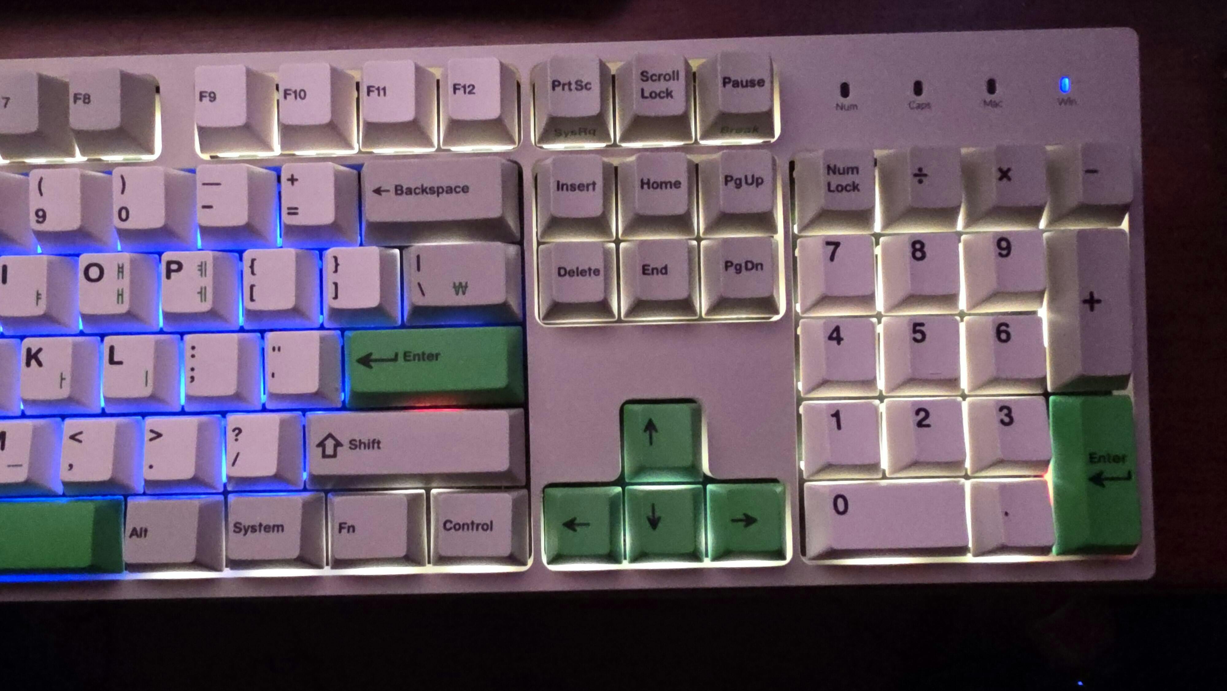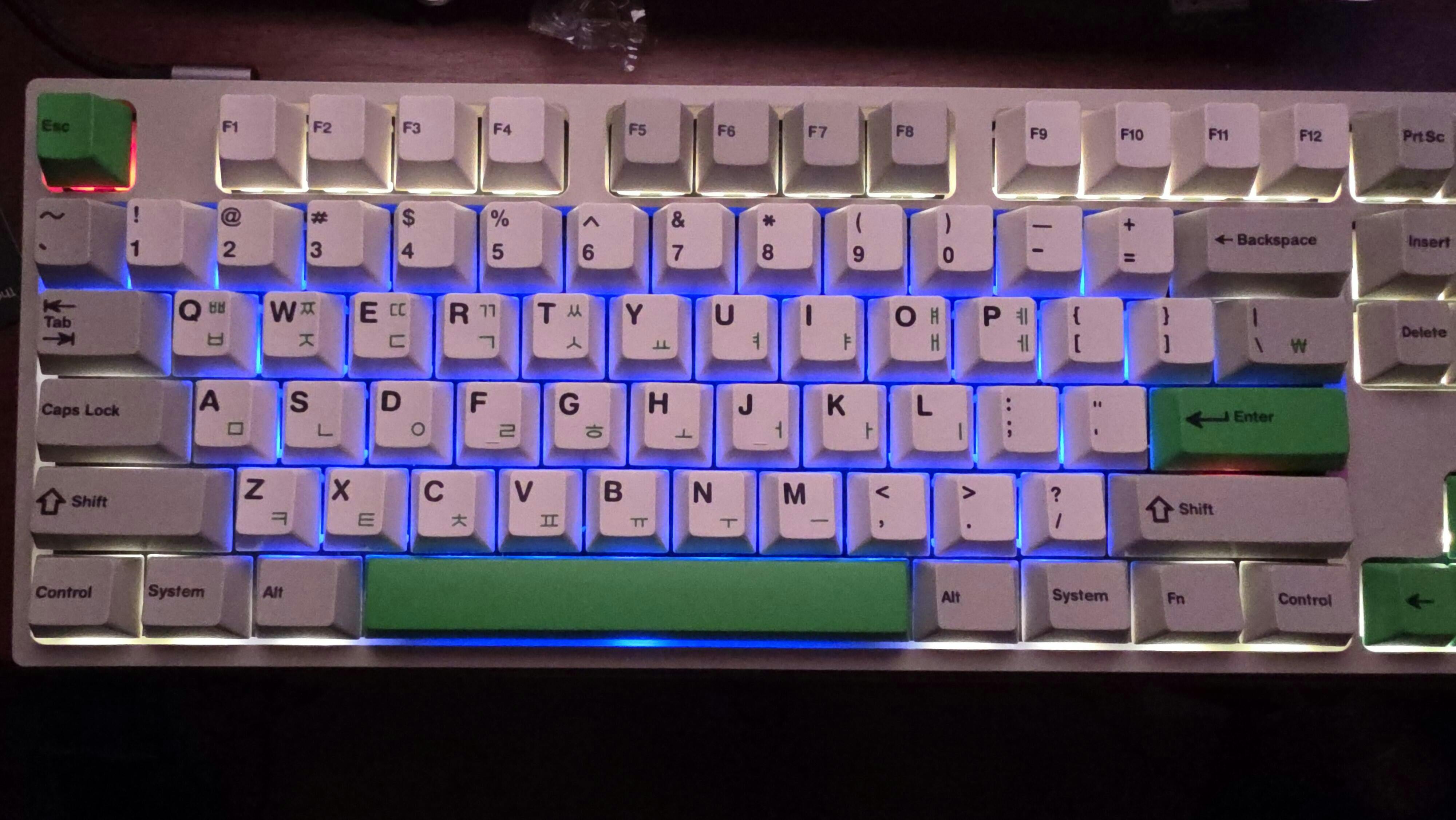 Beige alphas and mods are combined with green Hangul sublegends for a classic retro aesthetic! Several accent keys are included for a splash of green. The kit even includes split spacebars, a second 'B' for all the Alice-style keyboards, and 3-key-40's support!