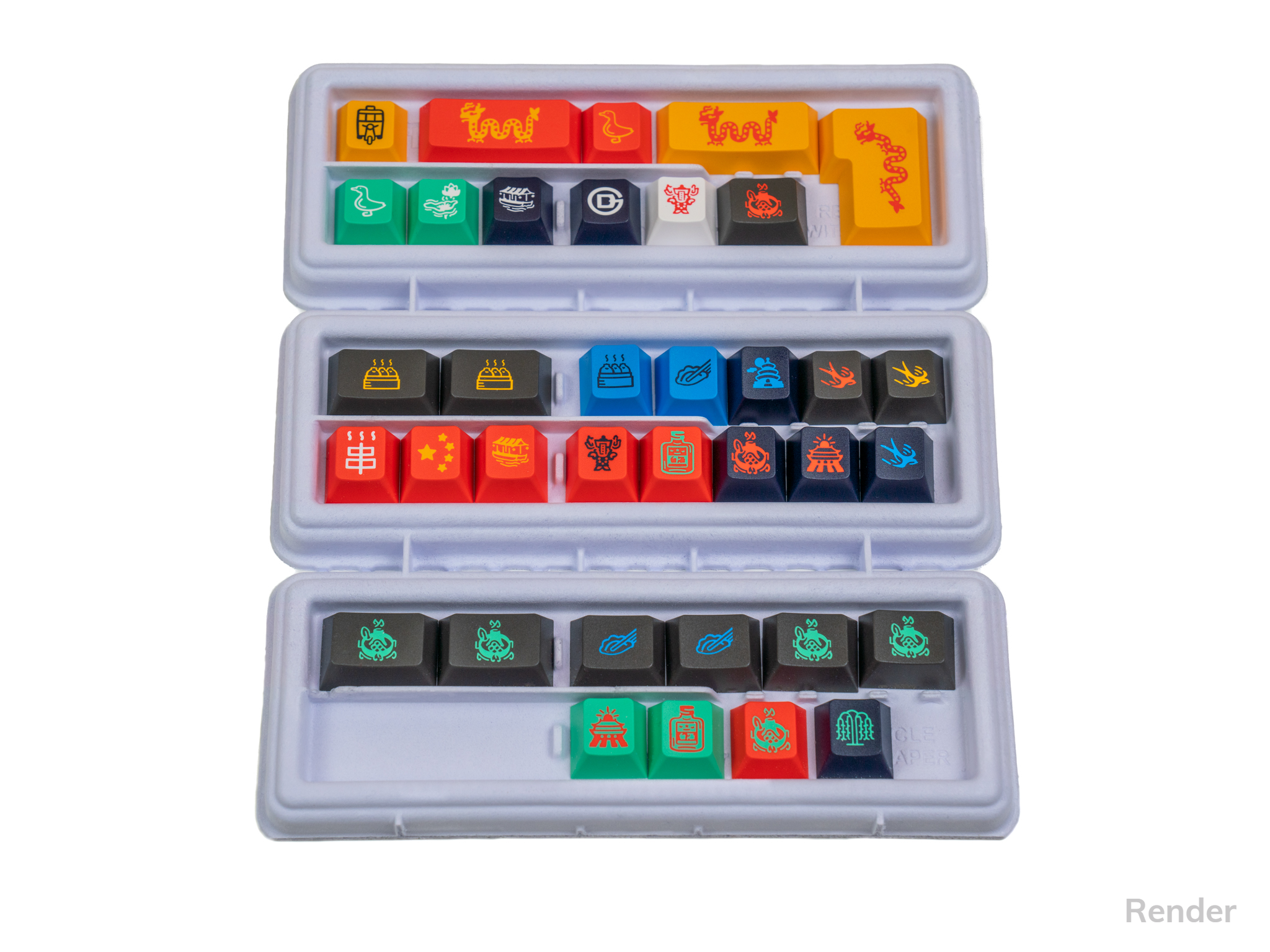 Bright legends and sublegends enveloped by a hazy gray backdrop set the stage for this keycap set based on the hidden Beijing lake. With multiple base kits sporting either simplified Chinese sublegends or Traditional Chinese sublegends, this set will transport you to the nightlife that accompanies Houhai. Multiple child kits are also available, including novelties designed in collaboration with Grundlemere's sibling, Maho.