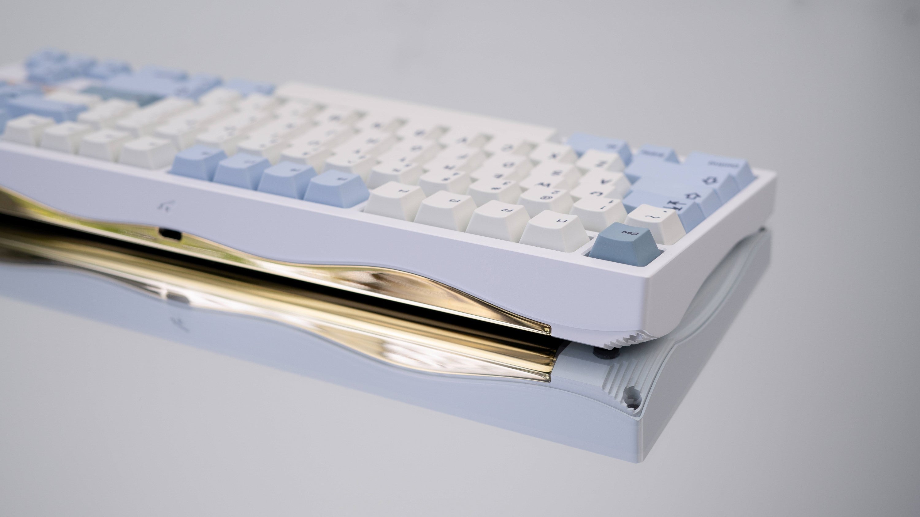 The Ripple TKL is a premium TKL designed by Upas from CannonKeys. Everything from the keyboard to the PCB is designed in-house! Some key design features of the Ripple are the customizeable badge on the front, the stunning side and back profile, and the wavy weight integrated into the bottom of the case.
