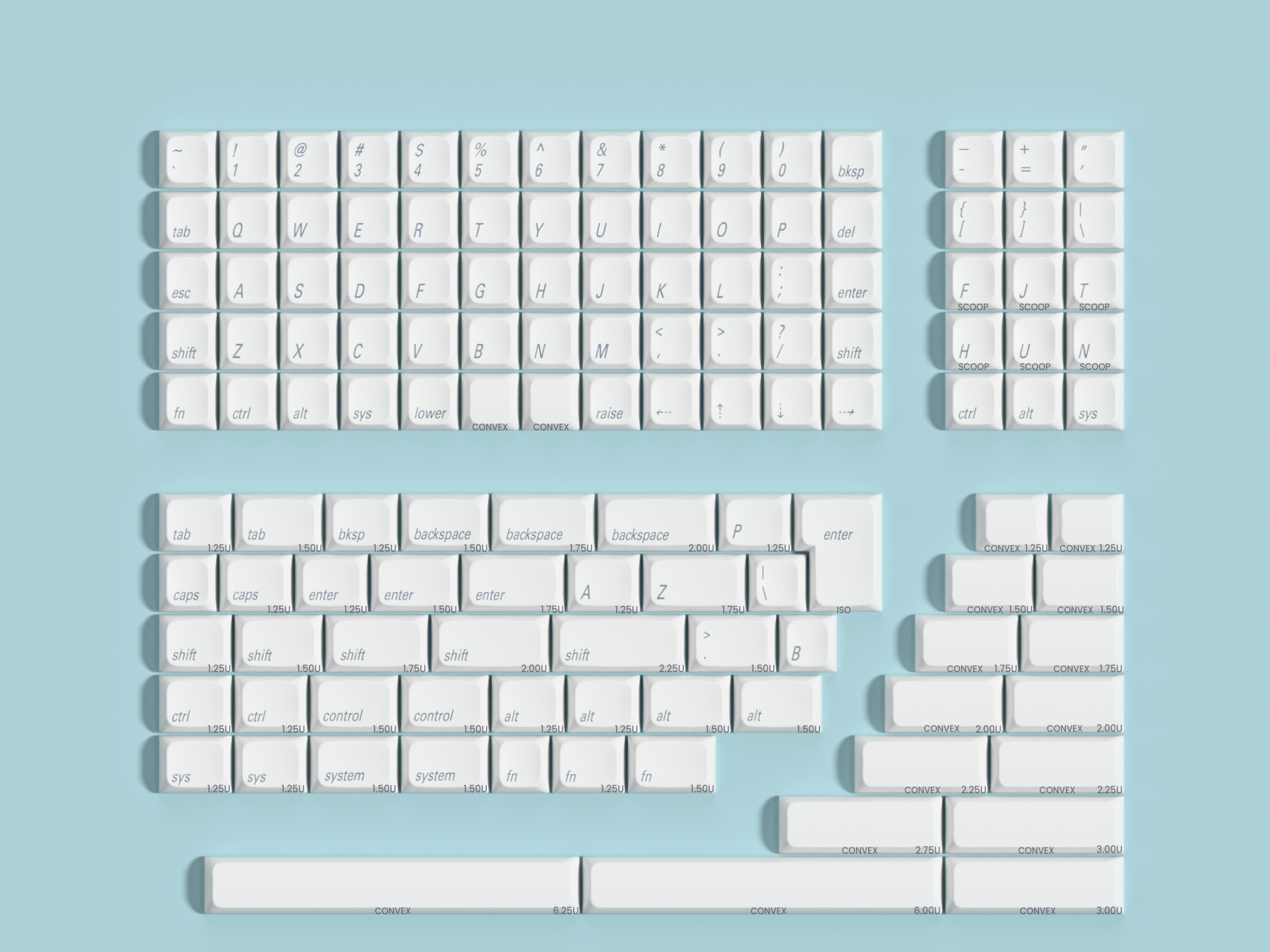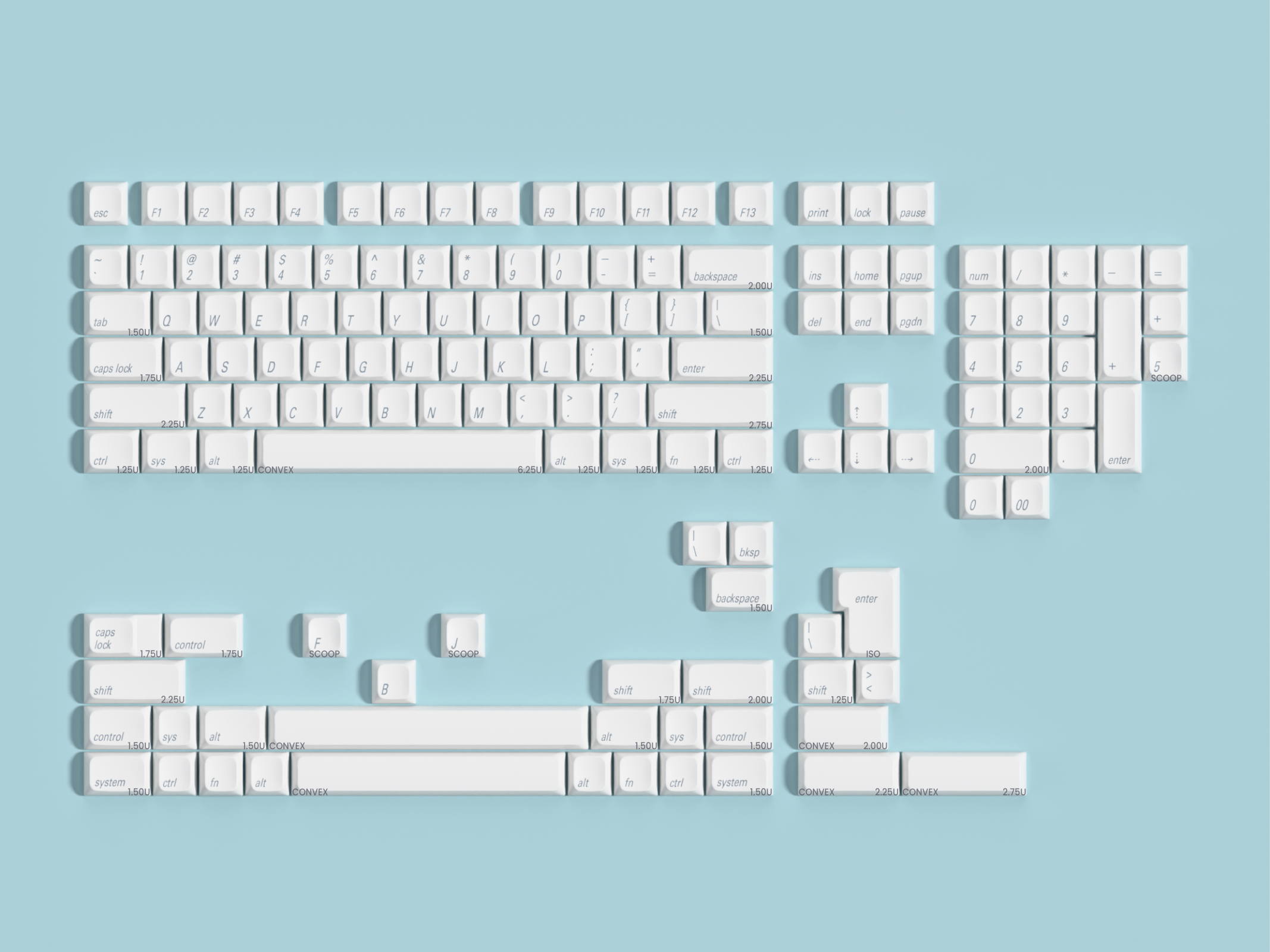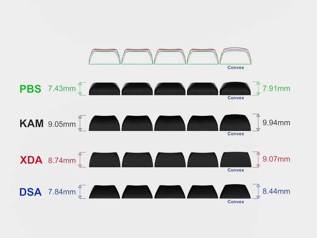 PBS uses a combination of a cylindrical front and back with a spherical top scoop. The result is a wide scooped contact area at the top, which enables a comfy and ergonomic typing experience.
