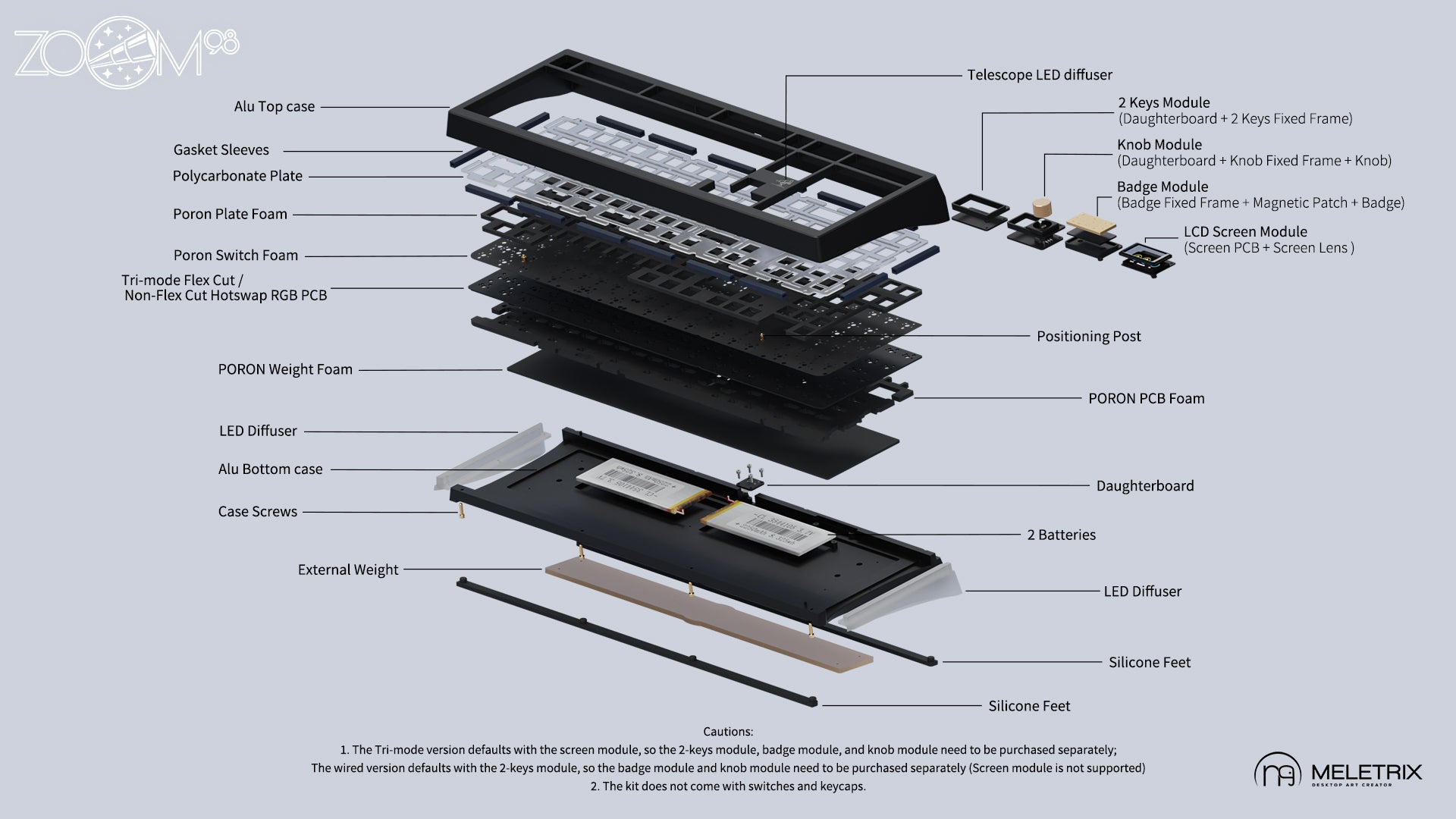 The Zoom98 by Meletrix is their latest installment in the Zoom Series of keyboards. This Zoom features per-key RGB and a layout that combines an 1800 and full-size keyboard, and comes with an LCD or Two-Key module by default! If you want to customize your board even more, there will be additional knob and badge modules available.