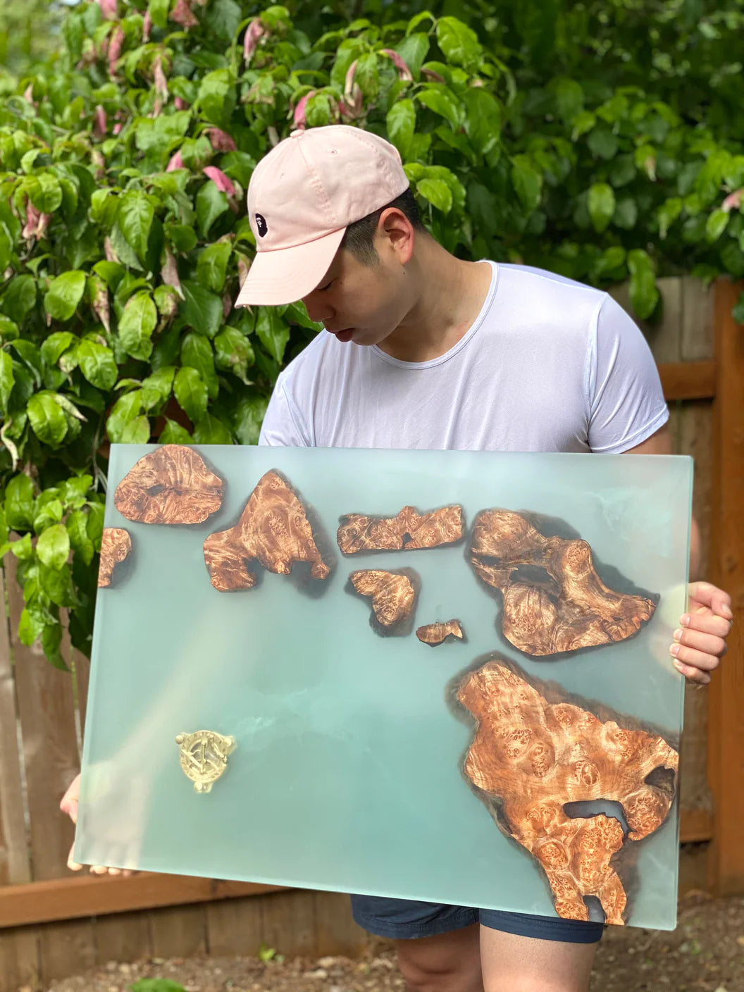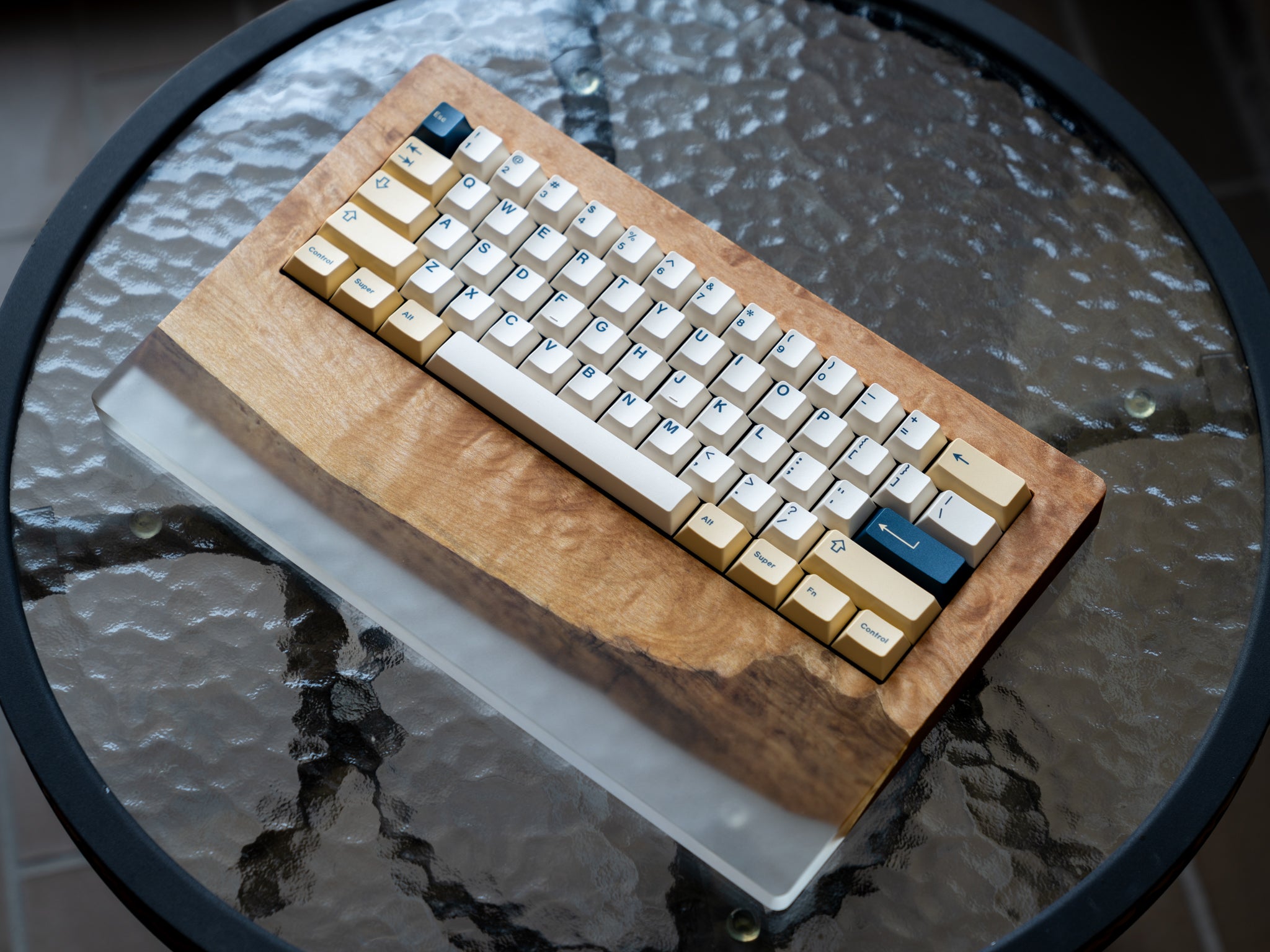 Every keyboard is unique designed and features a built-in wrist rest, where the live edge wood beautifully meets the resin.
