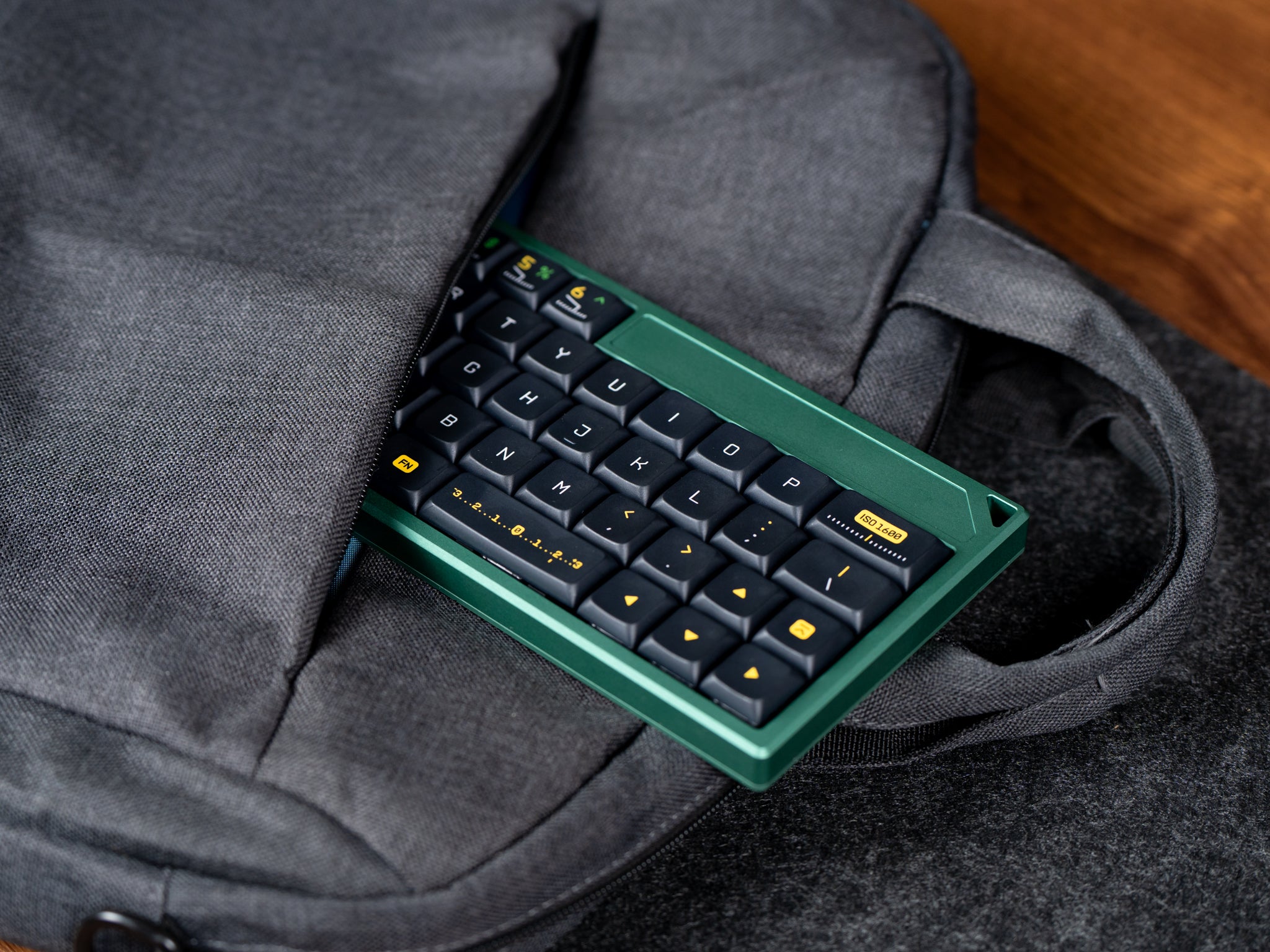 A 40-ish% wireless custom aluminum keyboard featuring low profile switches and a 12.75U wide V4N4G0N layout.
