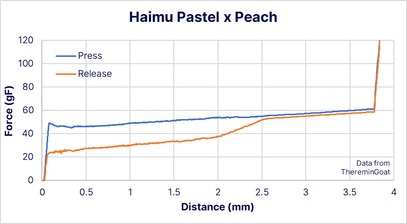 I am a bit of a shill for haimu switches, and this new CK collab is no exception. Haimu has some of the best and most consistent factory lubing among modern manufacturers (I do tend to find 1-3 audibly overlubed switches per batch of 90-110 though). These have a similar very high pitched sound profile to the Haimu x Geon HG Blacks, with the materials being almost identical aside from different top housing materials. If you want ready to go, very 'clacky' switches that do not NEED hand lubing, these are an amazing option, and will probably be a go to for me due to my proximity to CK and the very good price of these compared to other manus. In my sound test, the F1 brings out the high pitched frequencies, they can have a fuller sound with mids in other boards as well.