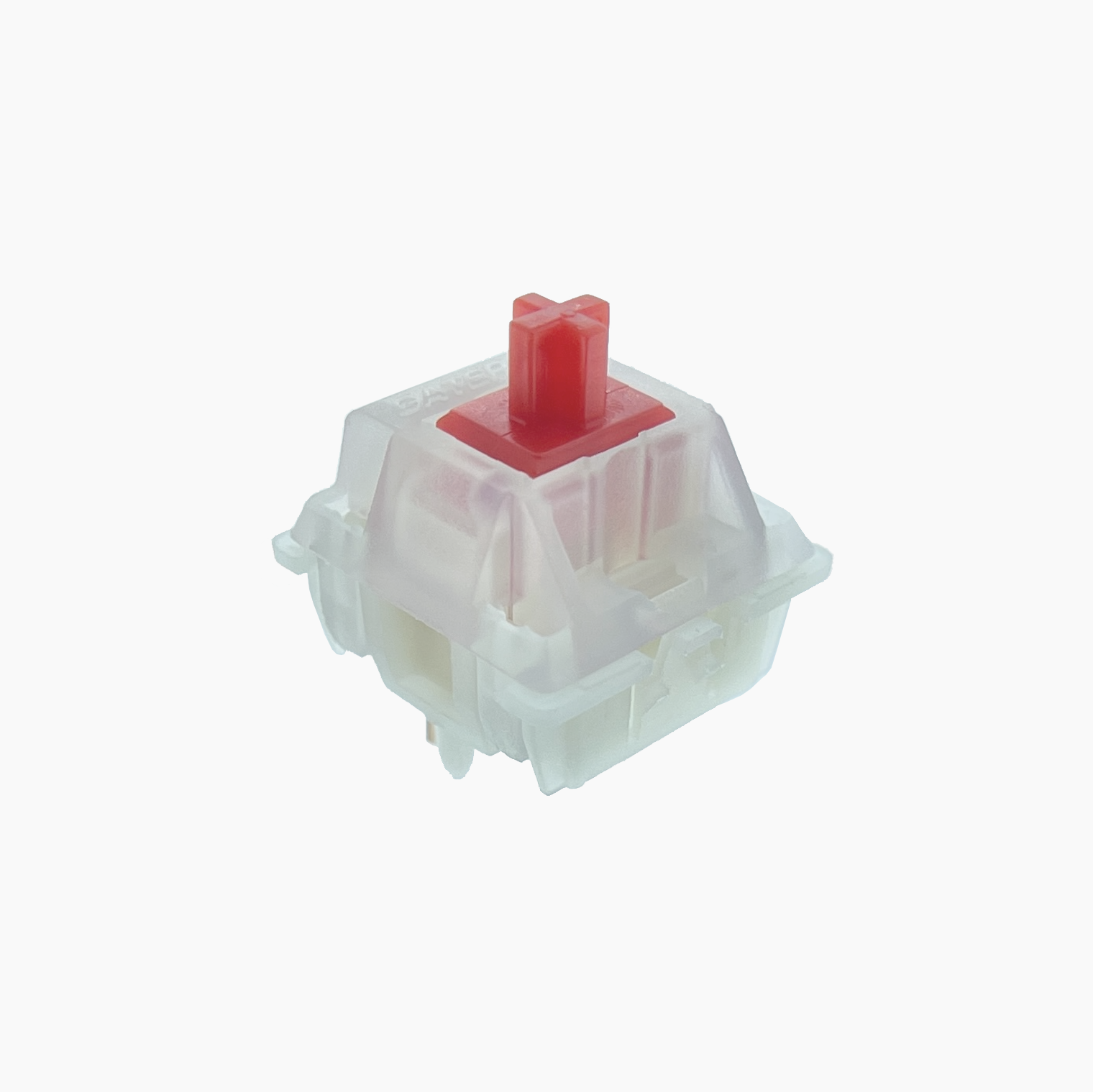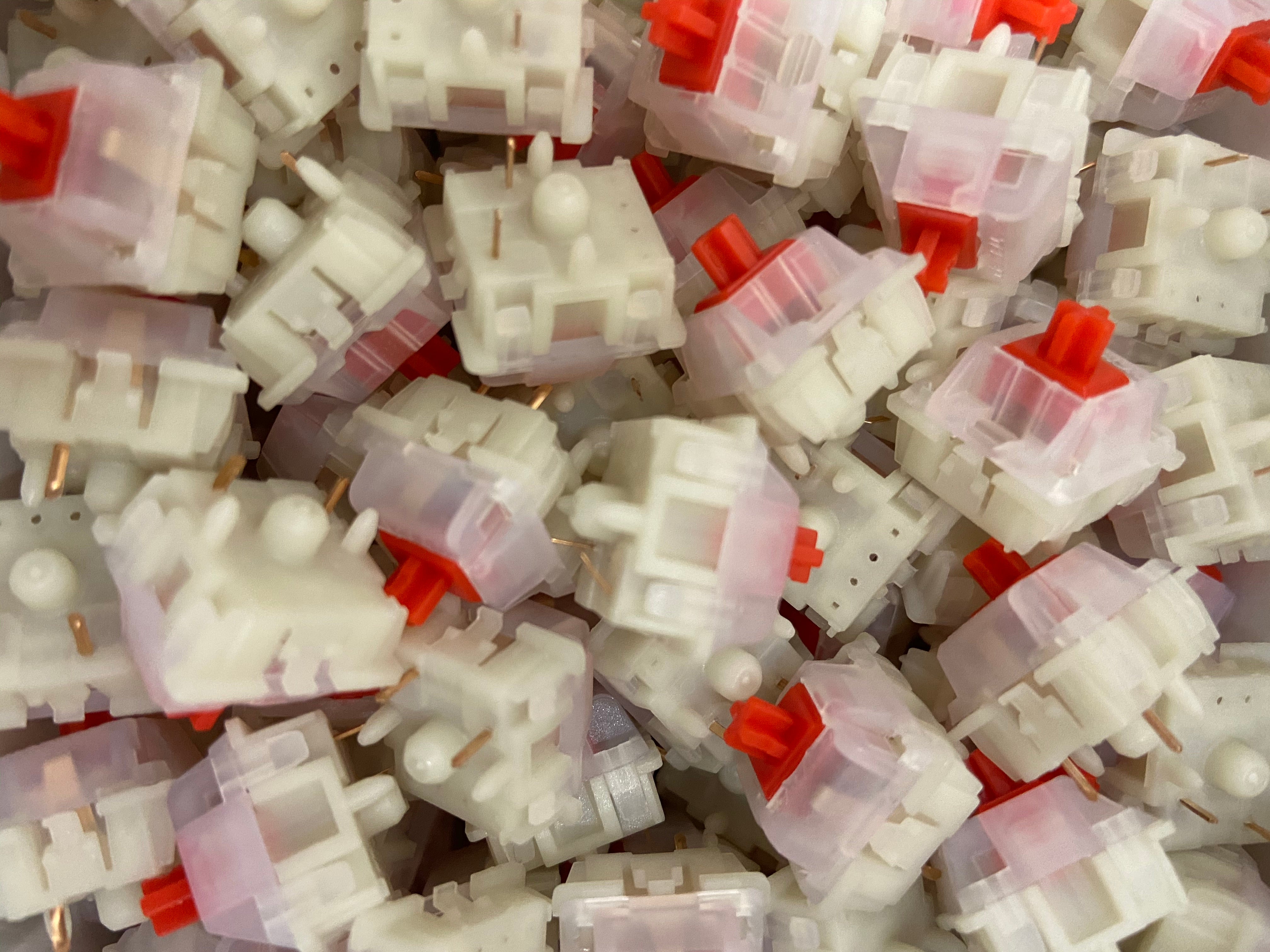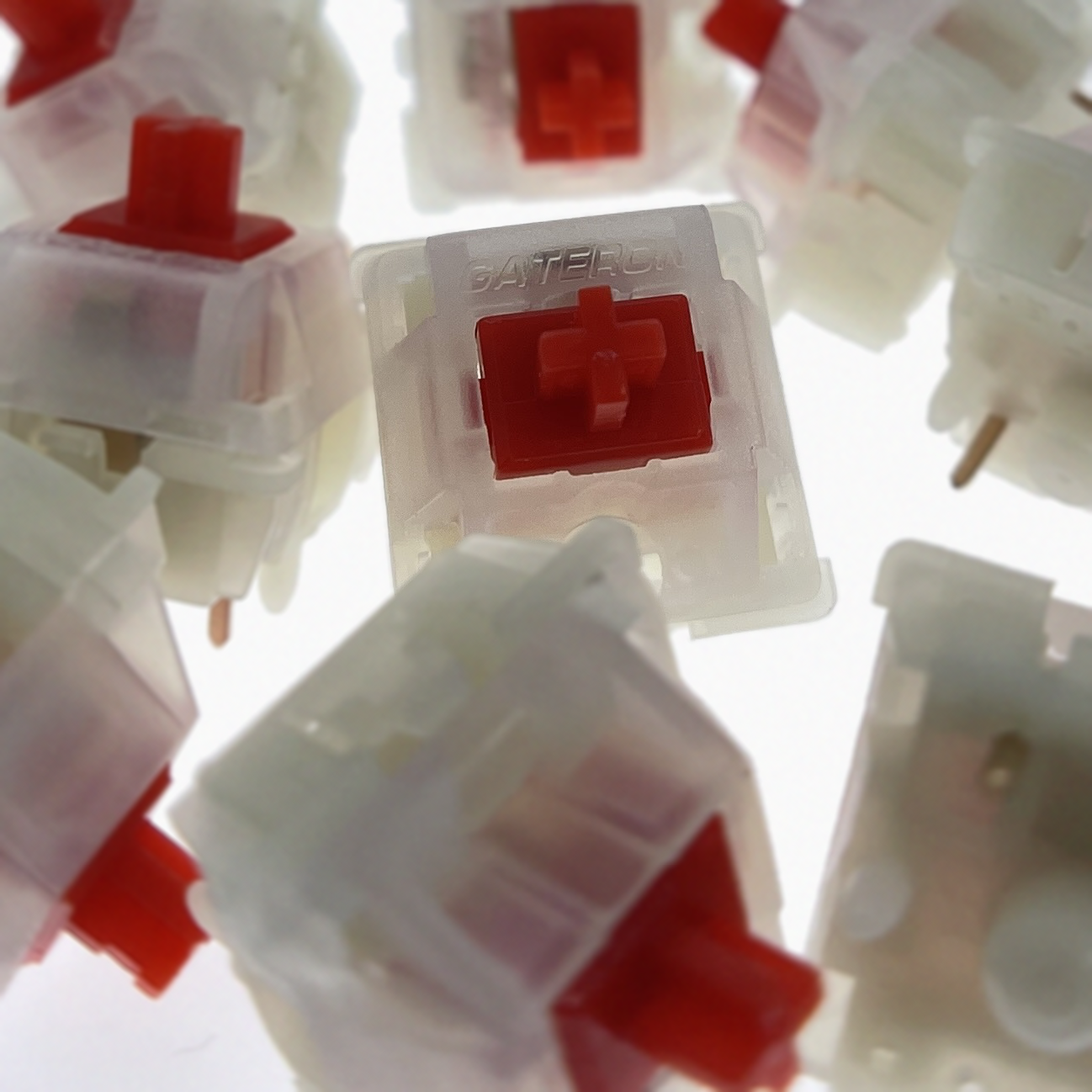 Our switches are produced by Gateron and feature PCB mount legs, as well as a full milky housing and top. They are weighted similarly to Cherry MX Reds.