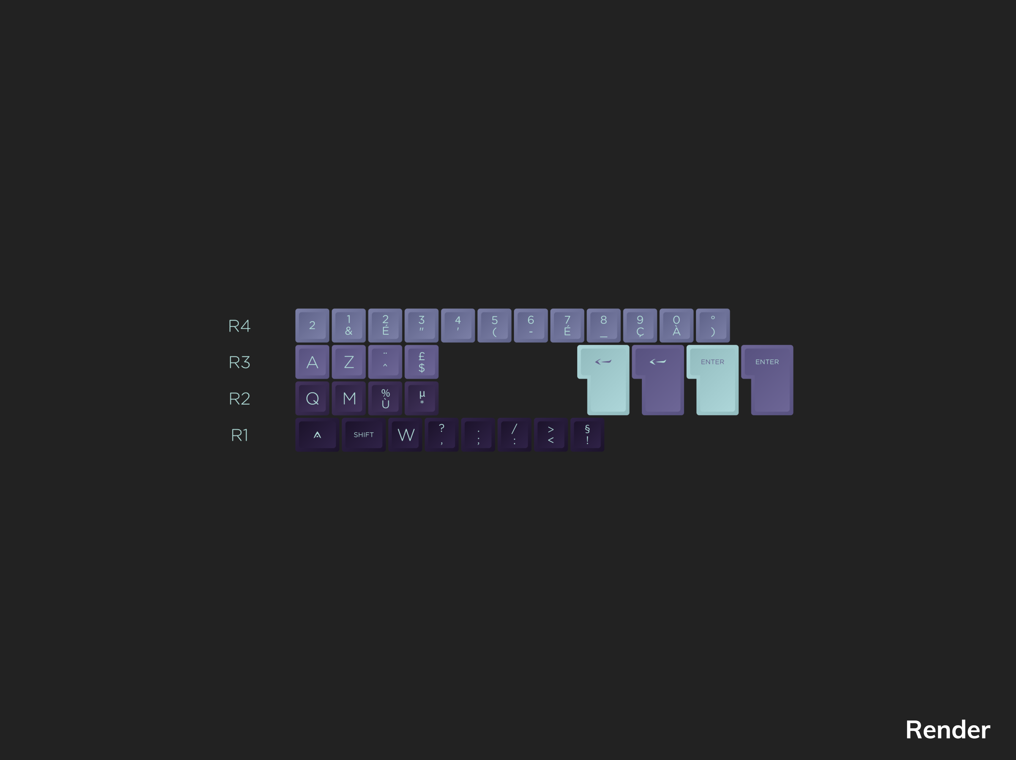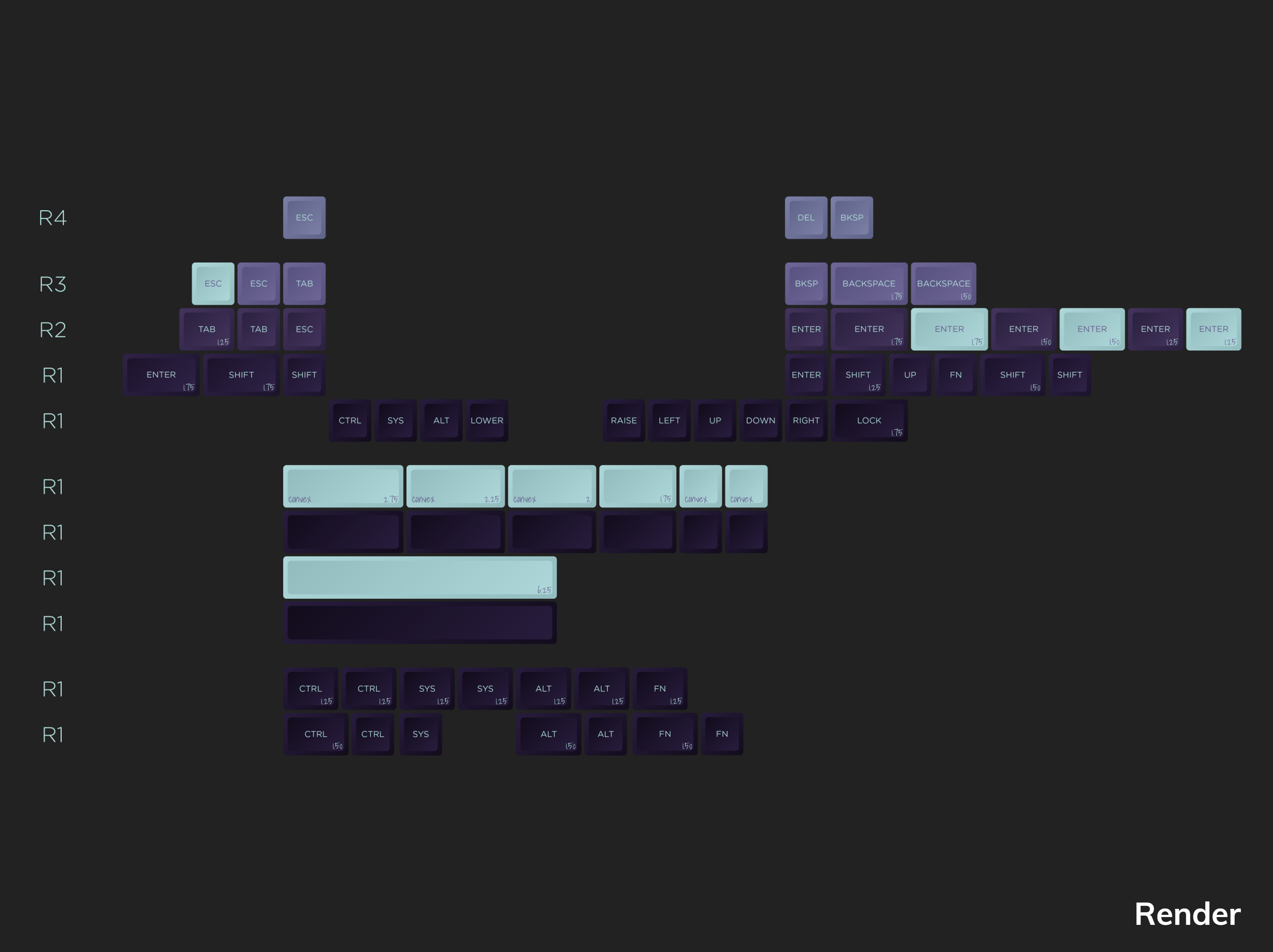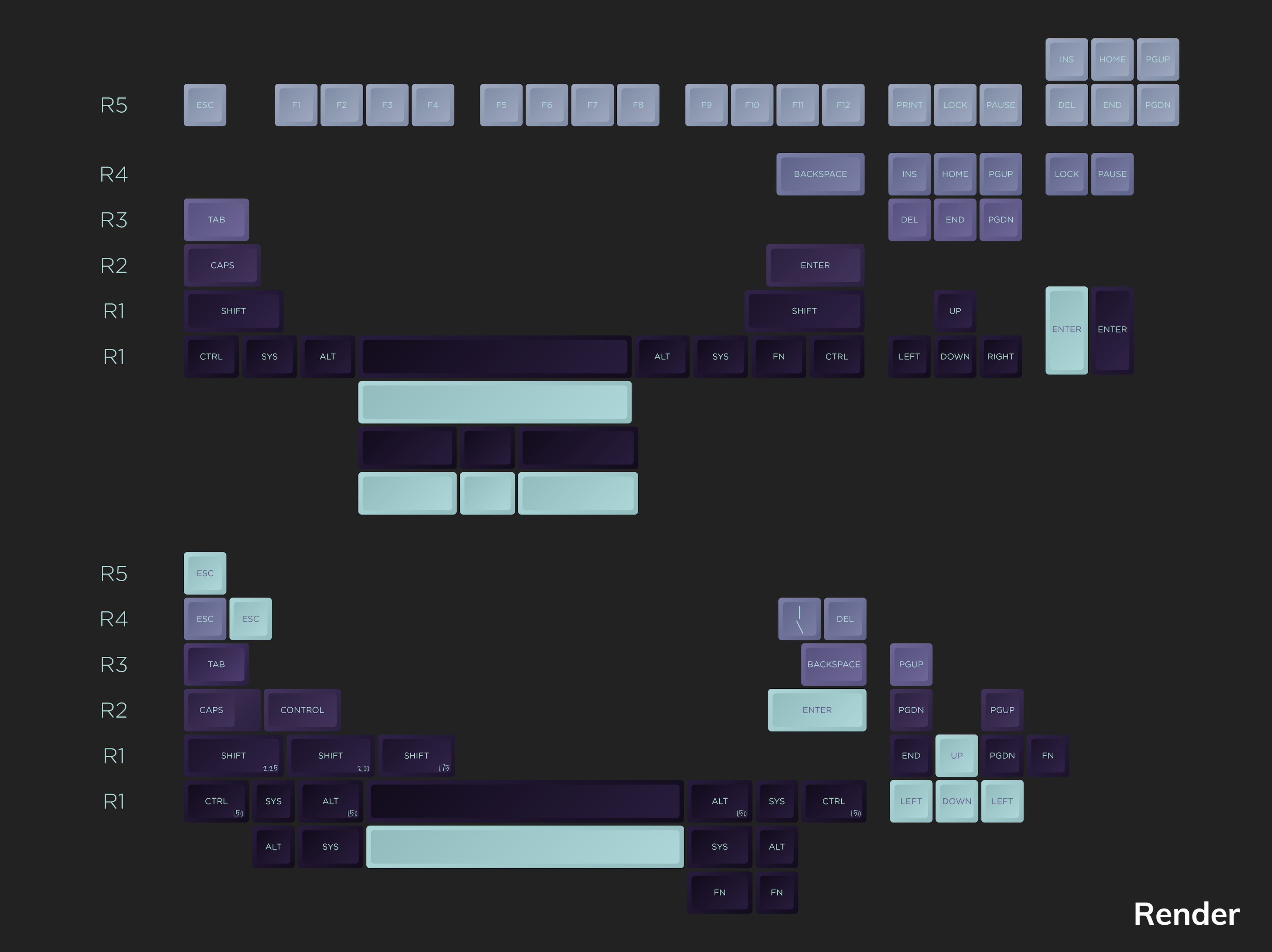 The 60s/TKL Text Mod kitting is slightly different than what was ordered and shown in the render. The only Fn keys are 1x 1.5u R1 and 1x 1u R1, and there is also 1x 1.25u R1 Menu key.