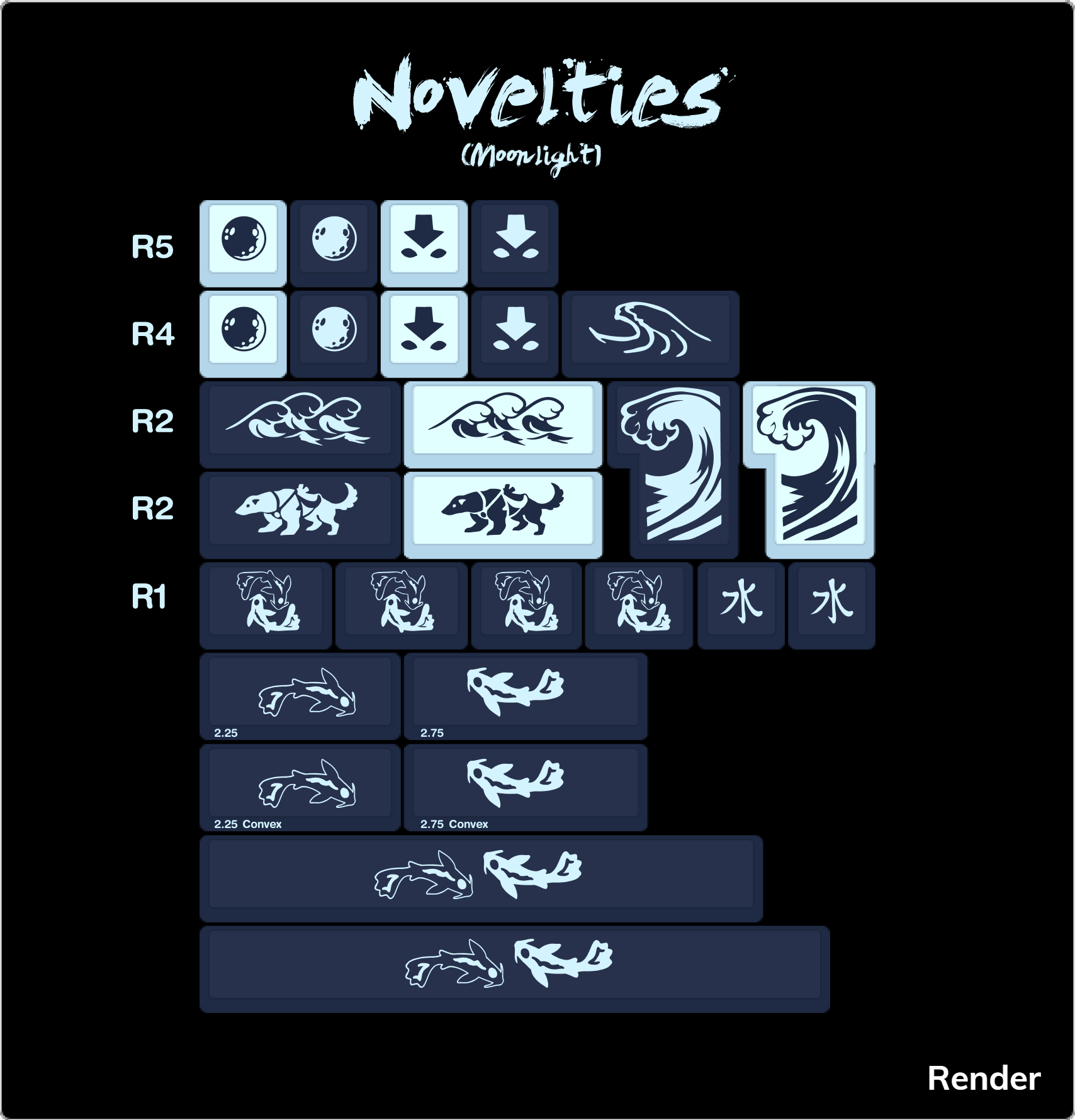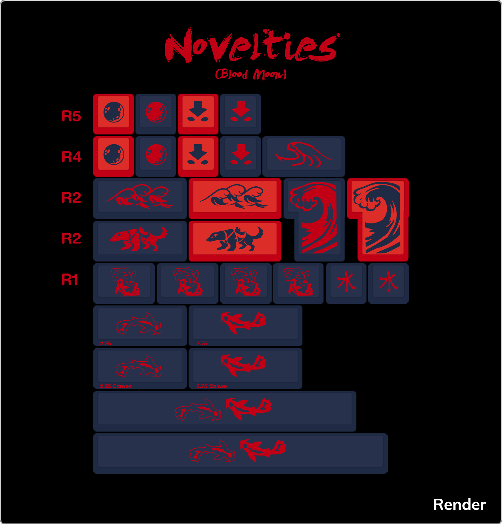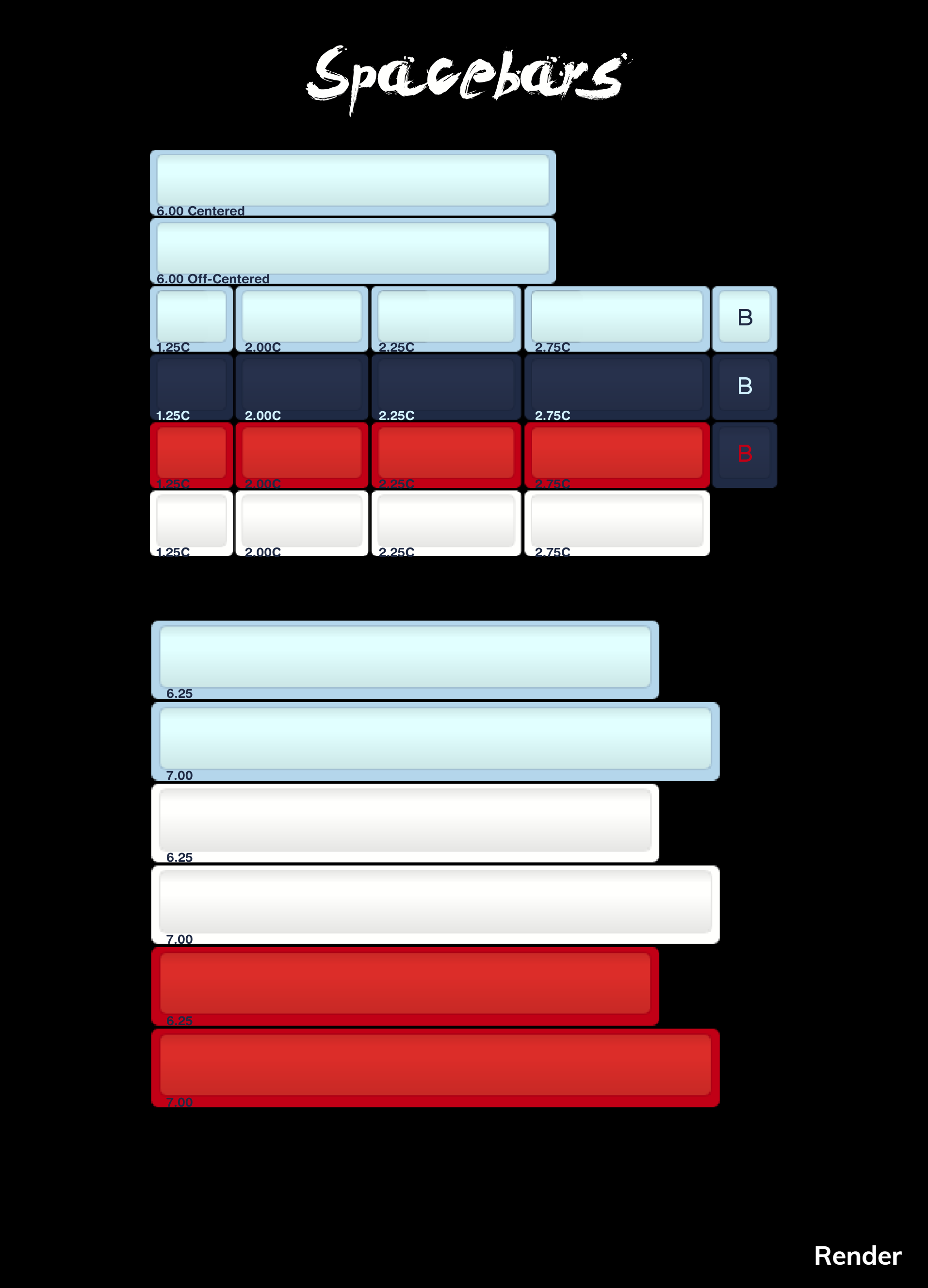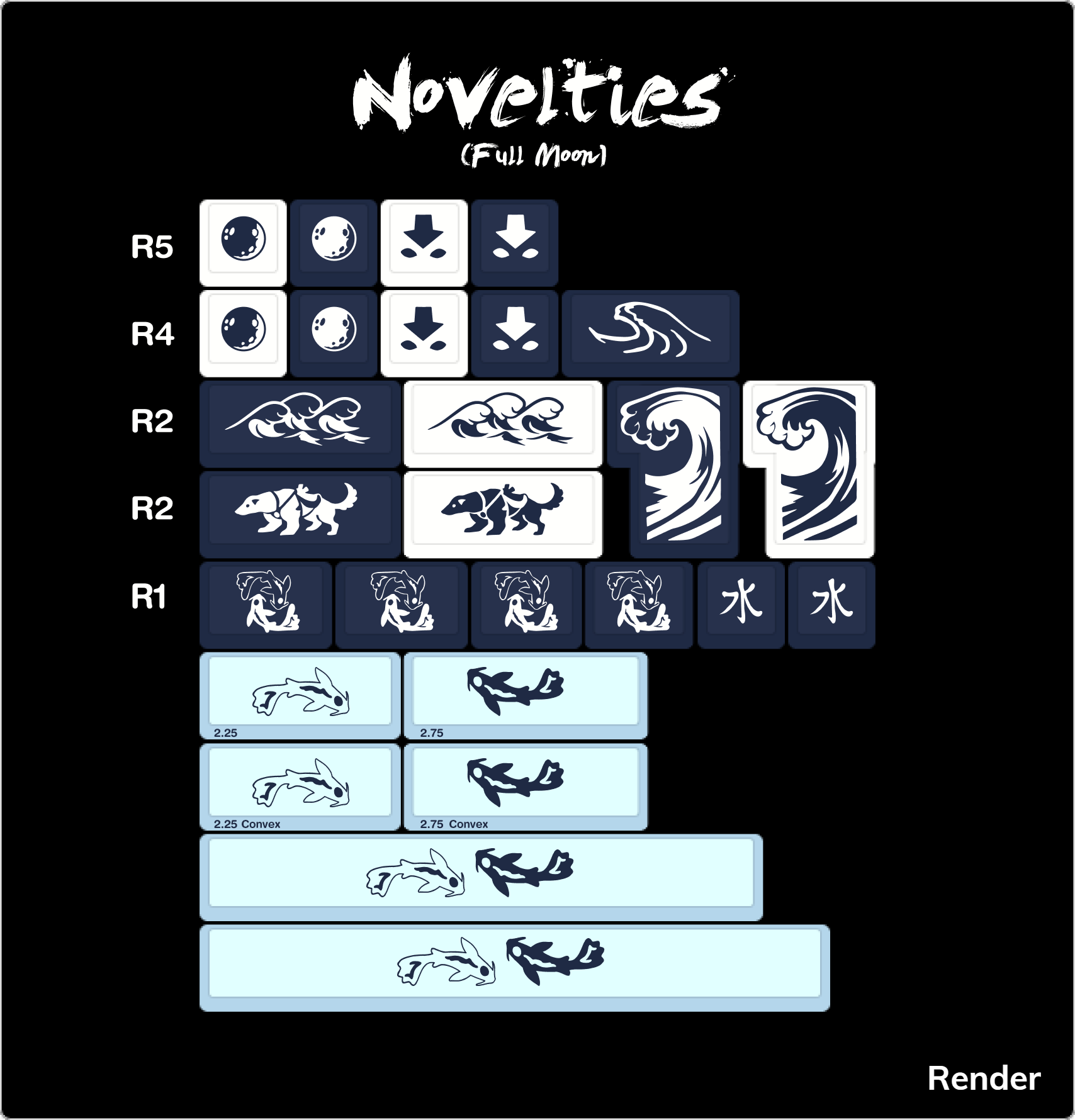 You will need an alpha kit and mod kit to cover a board - be sure you grab both! For a fullsize or 1800CP board, you will also need the numpad kit. Novelty 2.25u and 2.75u spacebars (convex) will be included in novelty kits.