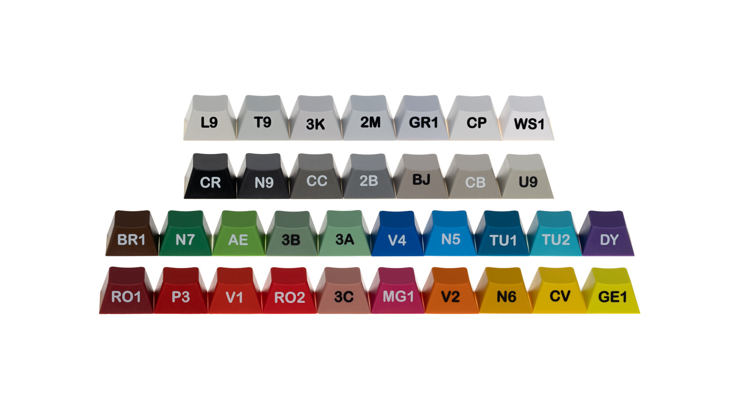 The colors in this set are matched to stock GMK colors, which can be seen in this listing as a point of reference. Alphas L9, Mods U9, Legends CR, Cyrillic Sublegends P3.