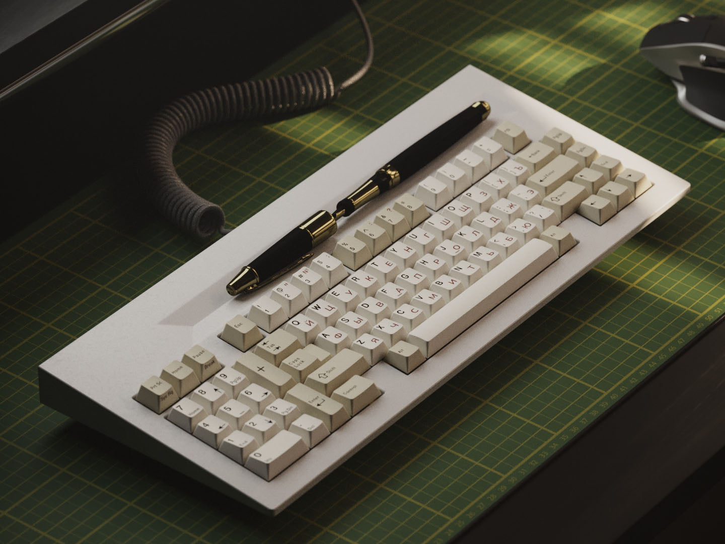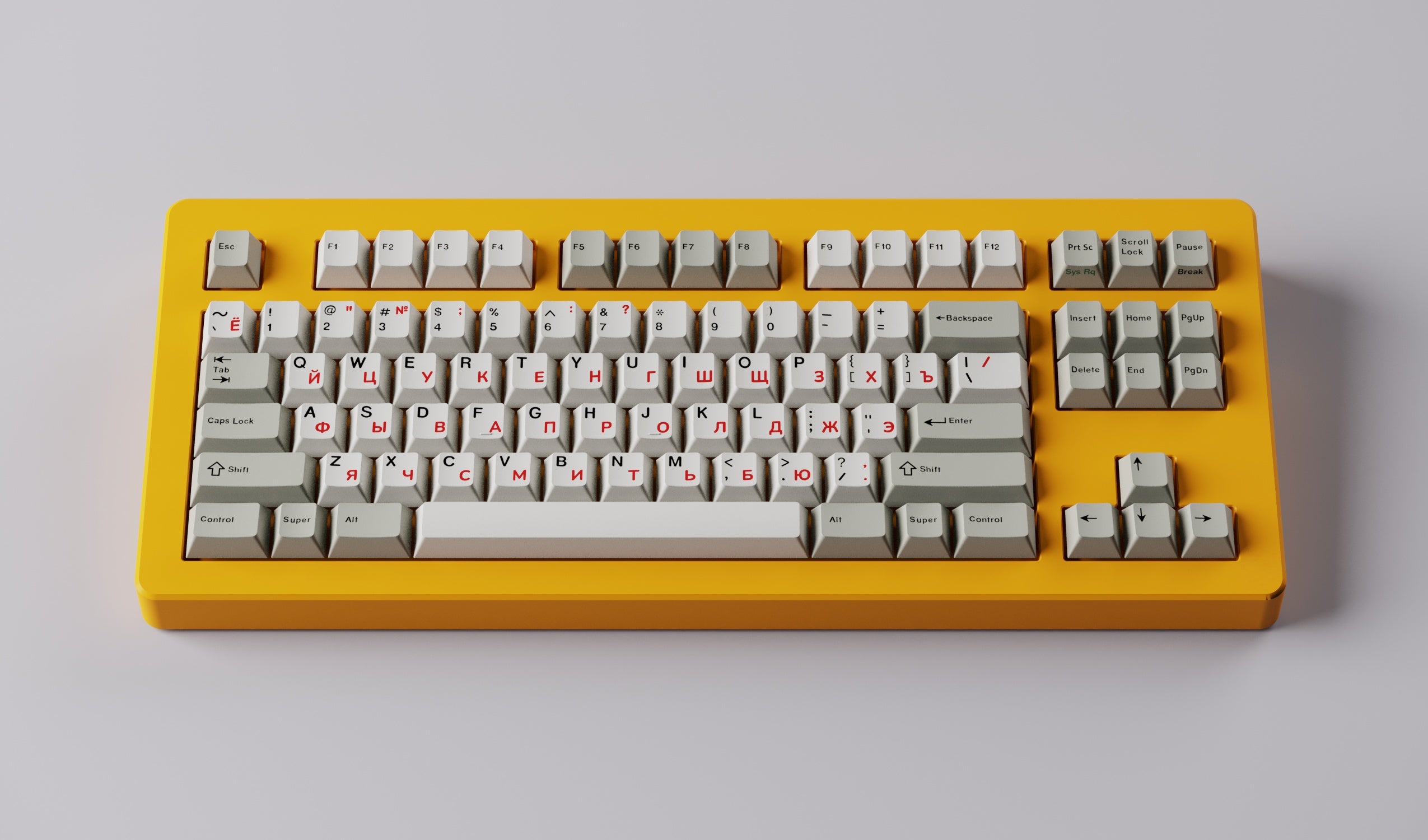 This doubleshot ABS keycap set manufactured by Keykobo features red pad printed Cyrillic sublegends. Inspired by vintage Cherry keyboards, this beige set works well on tons of keyboards and is a staple in many keycap collections.