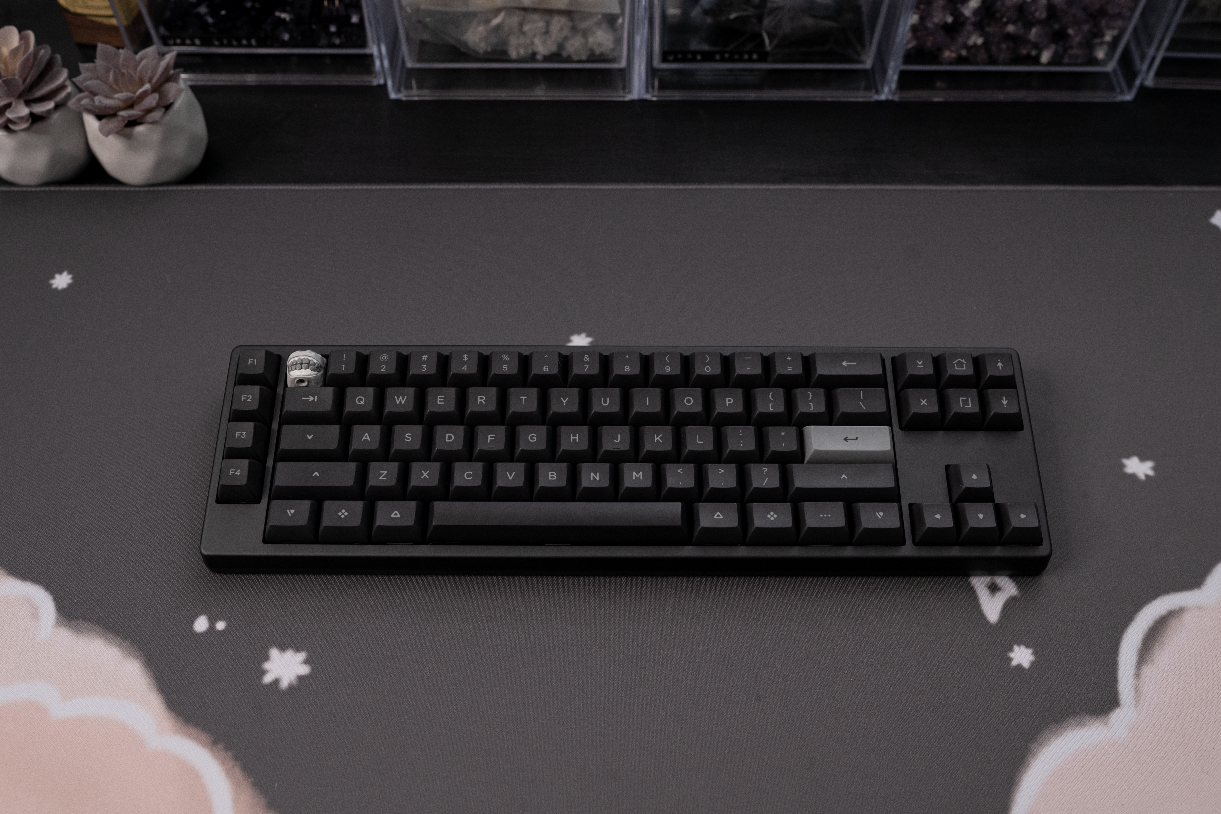 Designed by Minterly Studios, this kitty inspired keyset features light grey legends on dark grey mods, and green accents.