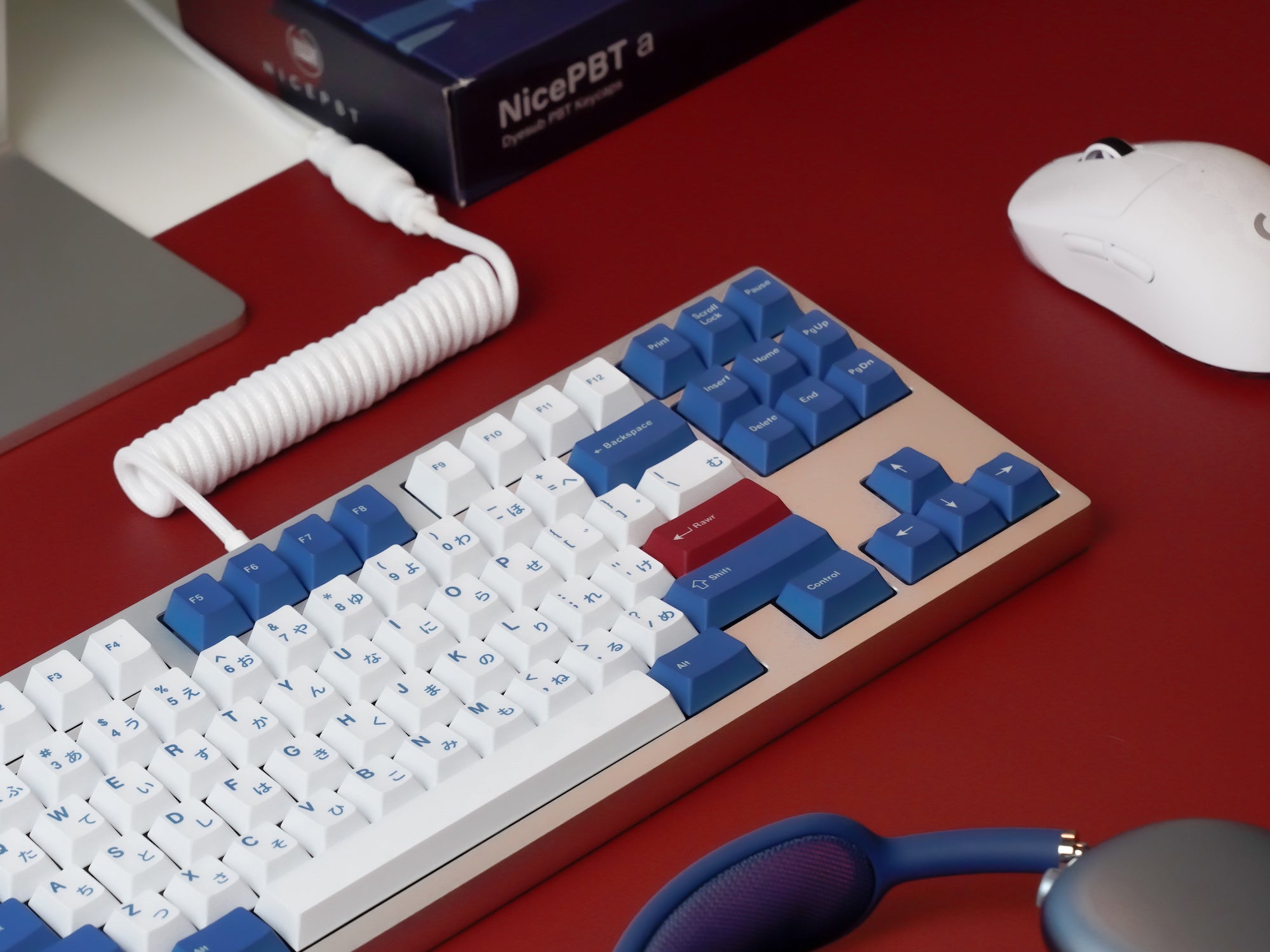 Designer Agilr brings his popular shark theme to NicePBT a! This set features blue on white alphas, white on blue mods, and white on red accents. Hiragana sublegends and themed novelties help round out the look. The kit even includes split spacebars, a second 'B' for all the Alice-style keyboards, and and robust 40's/ortho support!