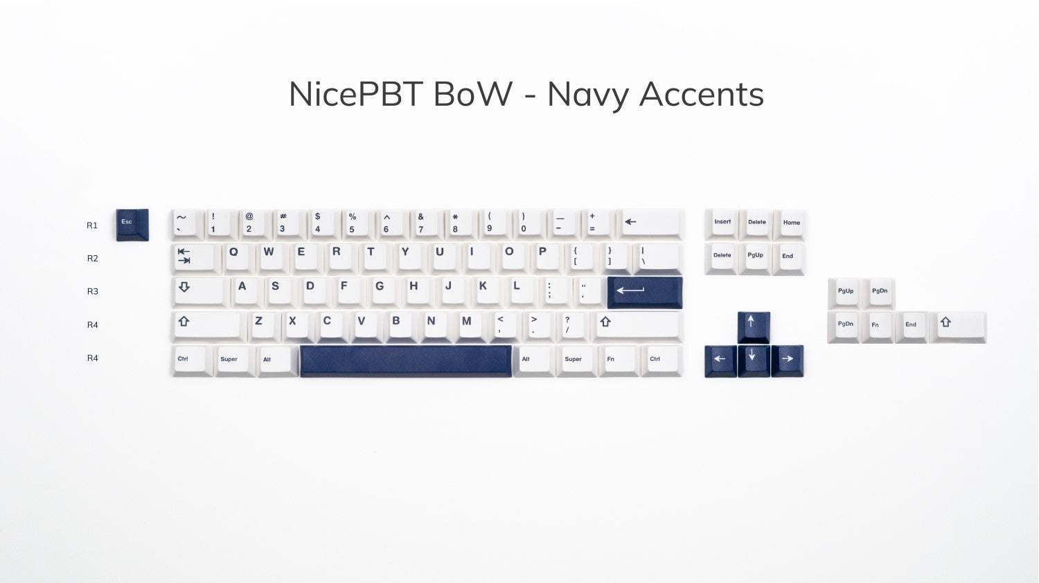 Our NicePBT Bakeneko keycap sets are a fantastic way to complete your Bakeneko60 or Bakeneko65 Build. The keyset is available in several accent colors, as well as a version with no accents. Available colors include Lavender, Blush, Grey, Blue, Navy, and Black on White!