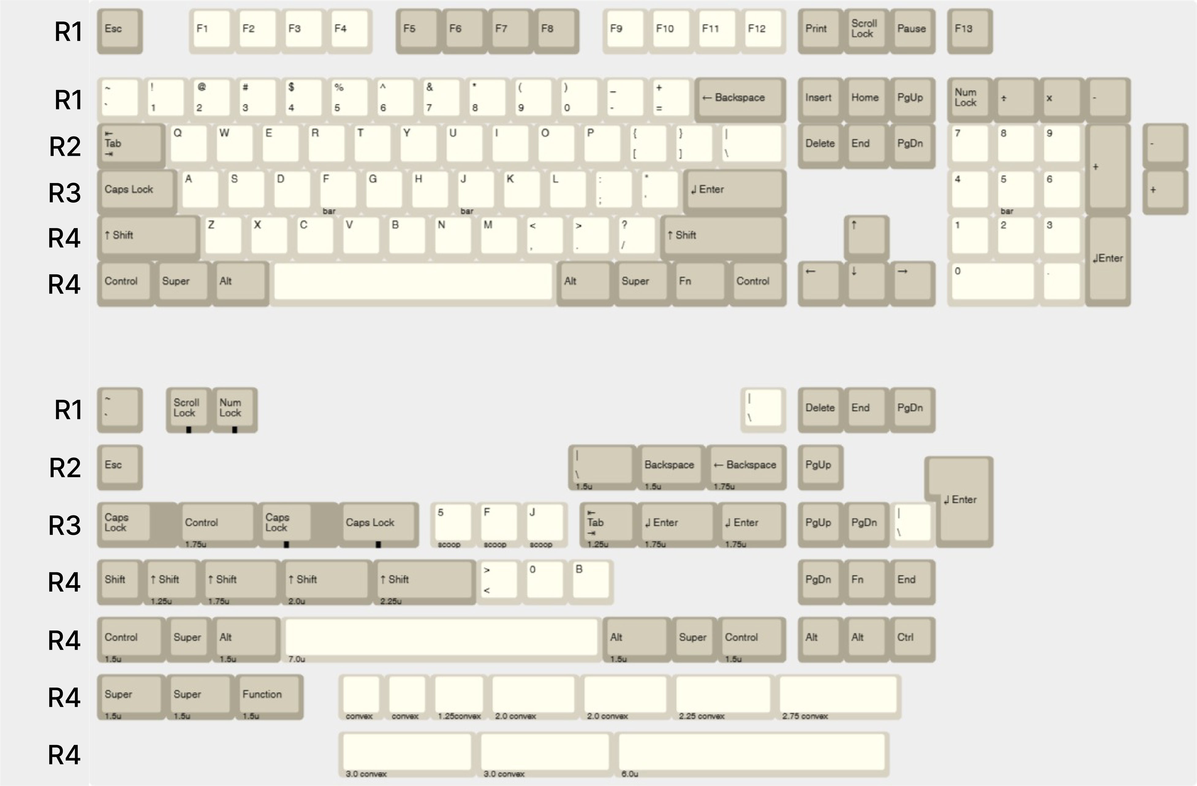 Heavily inspired from the beige found in vintage keyboards, NicePBT beige is a simple keycap set that looks great on most keyboard colors. The icon mods act as a modern accent on the vintage colors. The kit even includes split spacebars, a second 'B' for all the Alice-style keyboards, and 3-key-40's support!