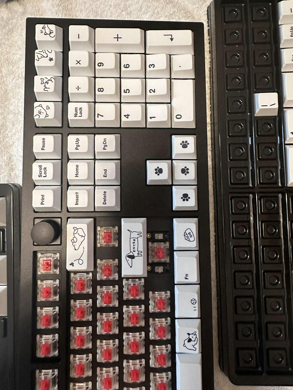 Dog lovers rejoice! This black on white keyset takes the classic colorway and adds a puppy themed spin. Several cute novelties are included in the kit to complete your dog themed setup. The base kit even includes split spacebars, a second 'B' for all the Alice-style keyboards, and robust 40's/ortho support!