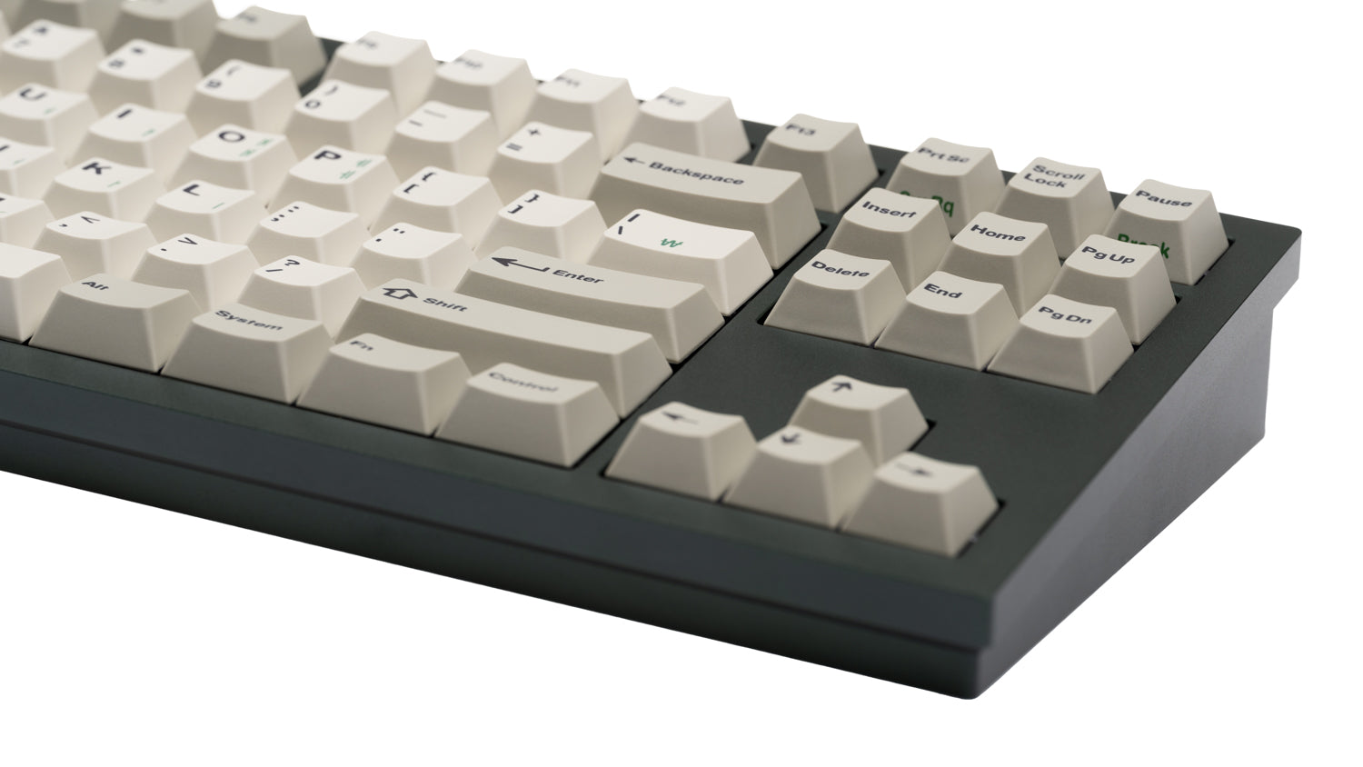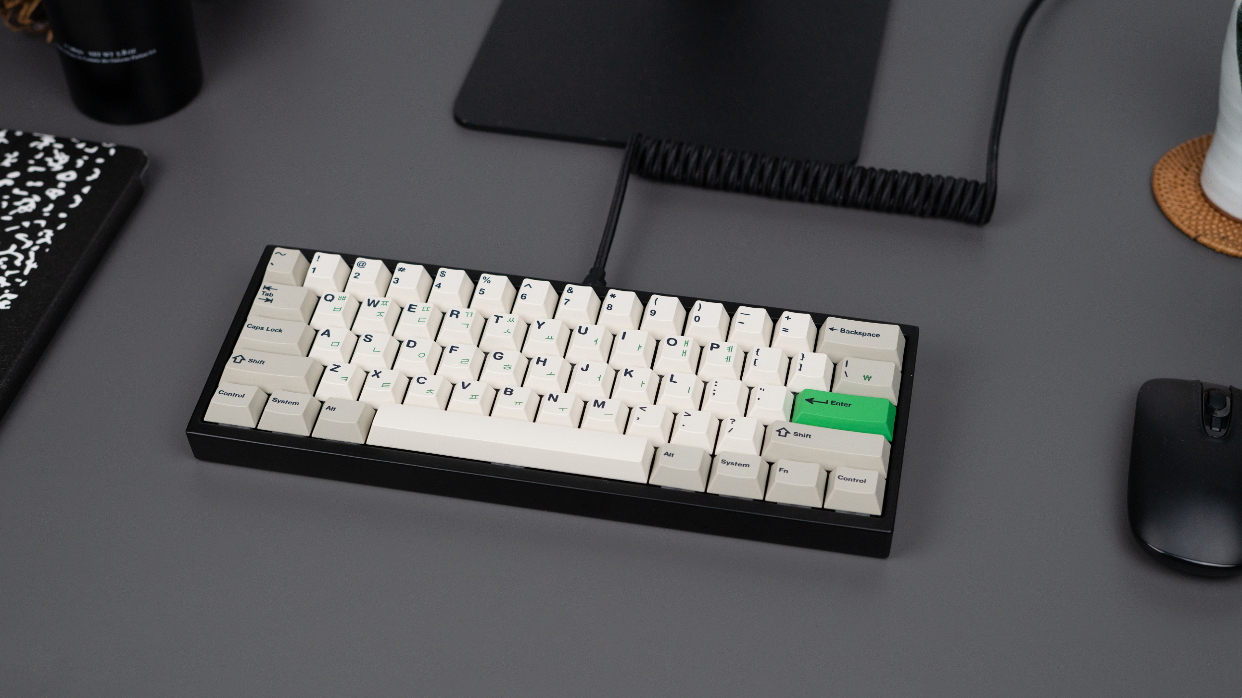 Beige alphas and mods are combined with green Hangul sublegends for a classic retro aesthetic! Several accent keys are included for a splash of green. The kit even includes split spacebars, a second 'B' for all the Alice-style keyboards, and 3-key-40's support!
