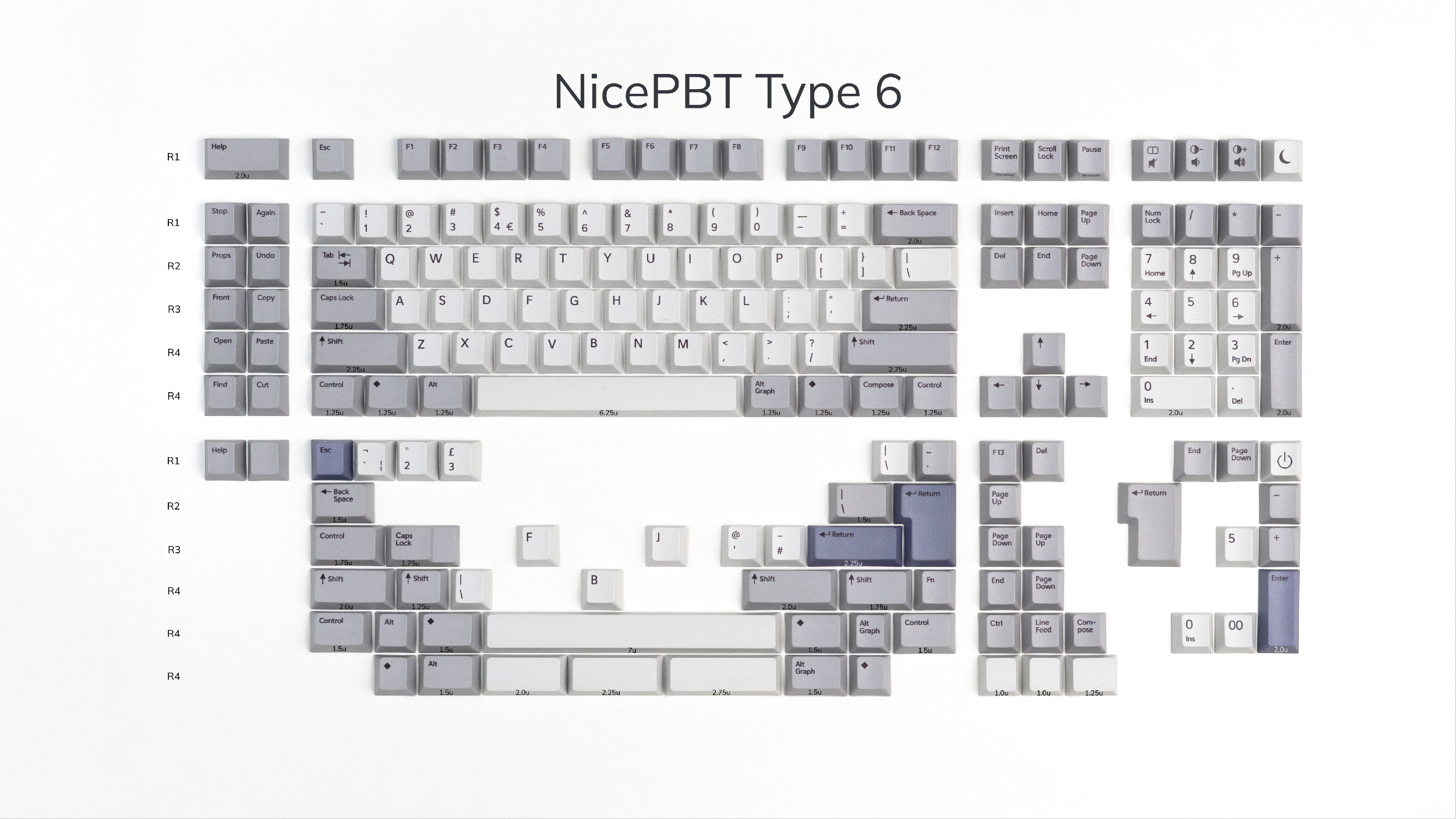 Heavily inspired by the Sun Type 6 keyboard, this set features light alphas and light grey modifiers that look great on most keyboard colors. The light purple accents add some subtle color to the classic aesthetic. Also included are several unique navigation keys and macro column keys as well as novelties. The kit even includes split spacebars, a second 'B' for all the Alice-style keyboards, and unique legends!