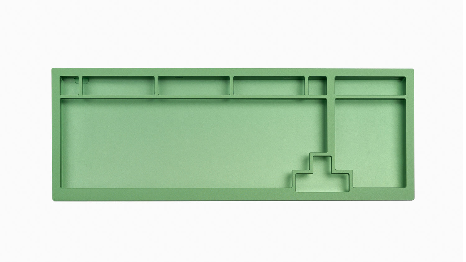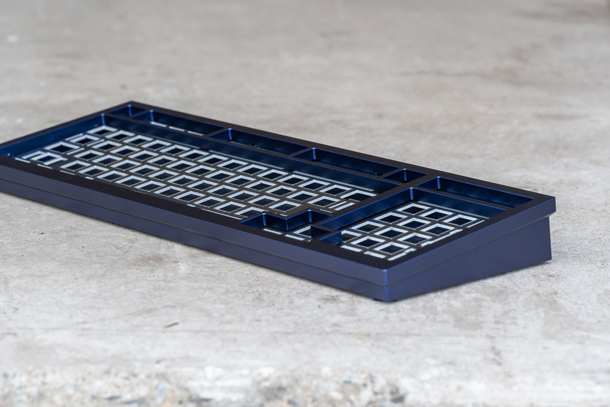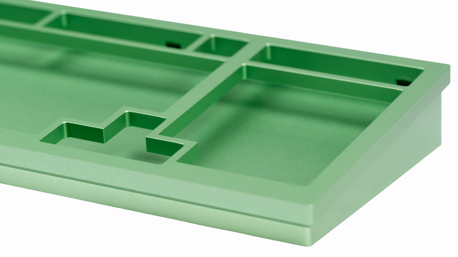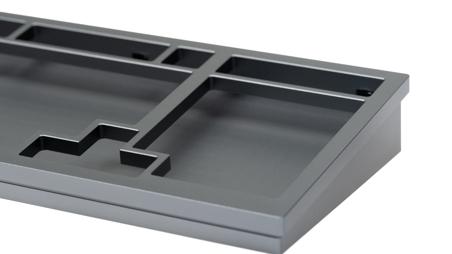 The Rekt1800 CNC keyboard in our Brutalist Series of in stock keyboards. The solderable PCB included is QMK/VIA supported and USB-C, and the mounting style is a slightly modified top mount called Burger Mount. Burger Mount takes the evenness from top mount and uses o-rings on the mounting screws to make the typing experience slightly less harsh.