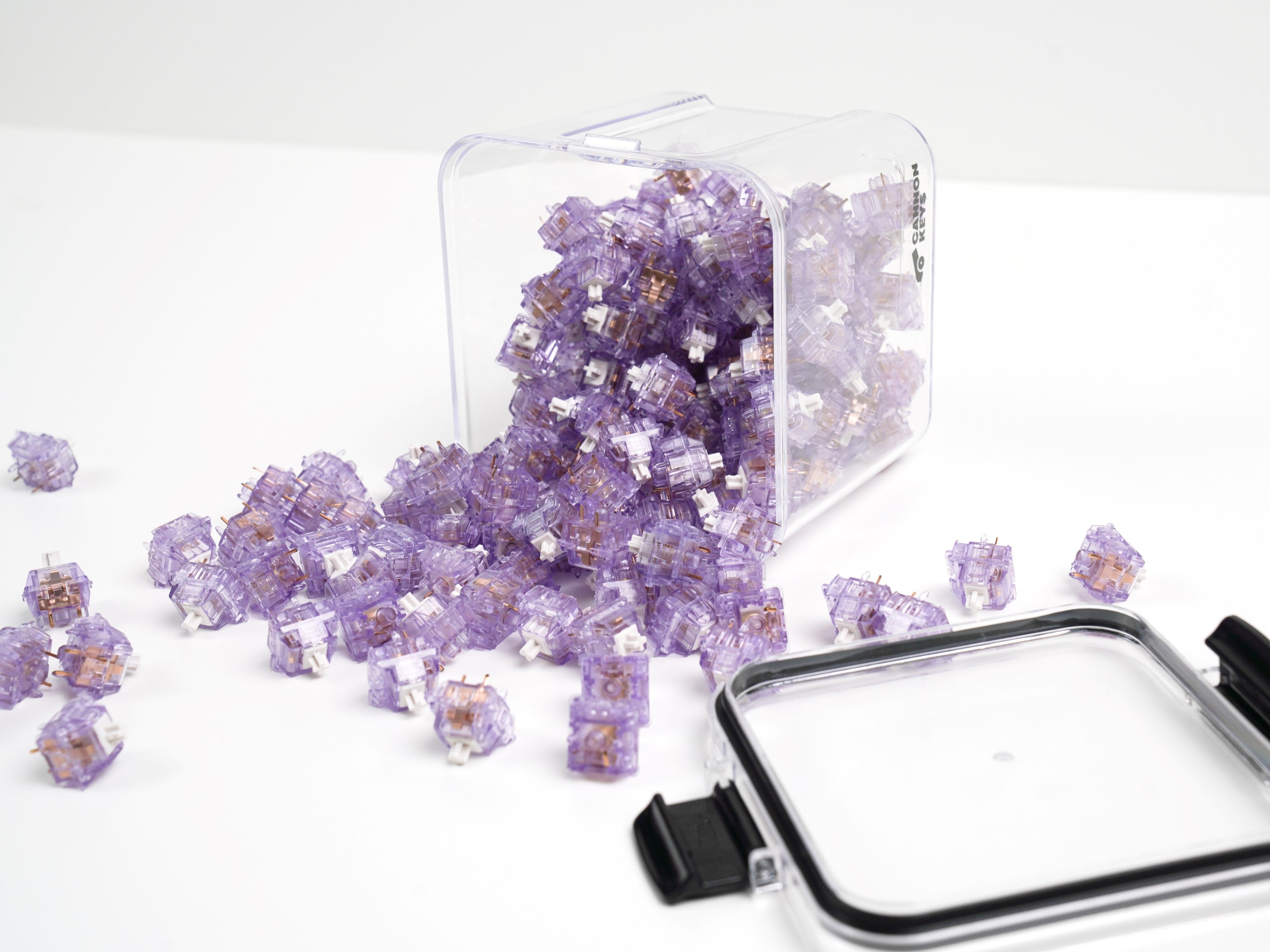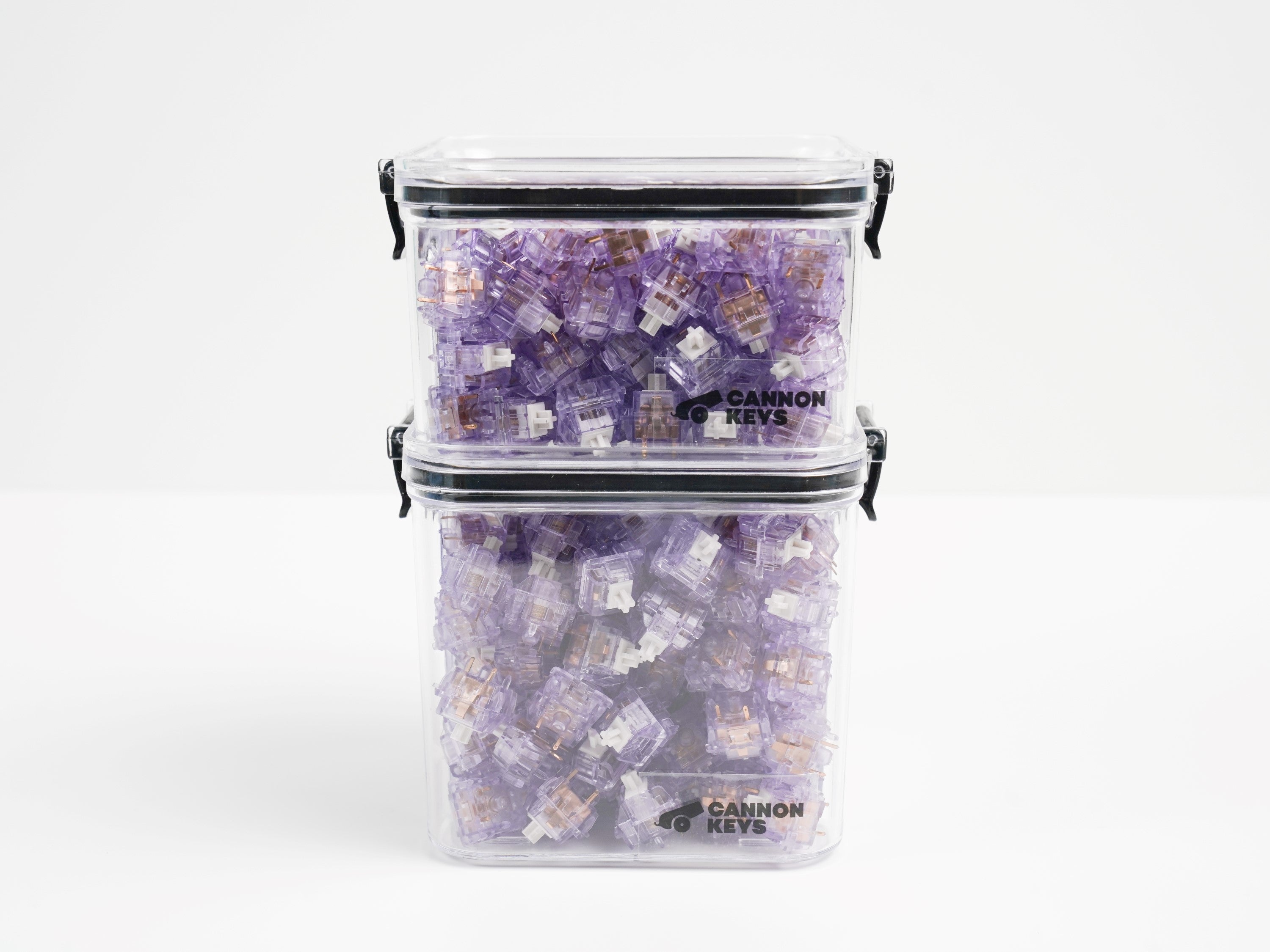 Available in two sizes, our switch containers are made from clear plastic with a latching lid. Perfect for switches, keycaps, or whatever else you have laying around! The branding is a removeable sticker that can be taken off should you wish to not have it there.