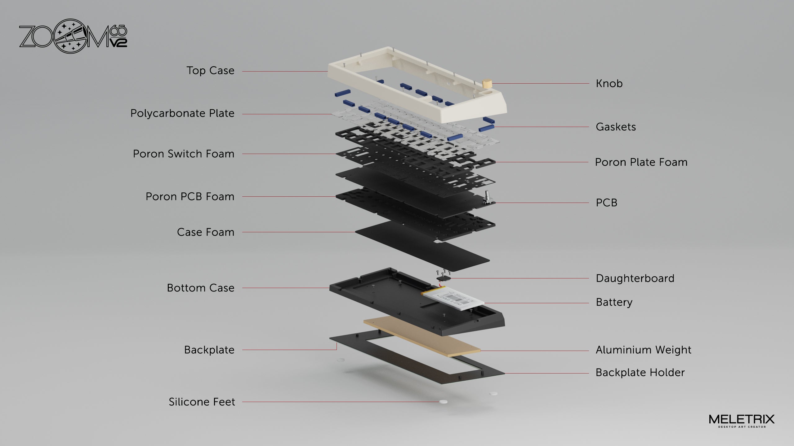 Introducing the Meletrix Zoom65 V2 - the newest keyboard in the Zoom Series. This revised version features a glass backplate, external weight, knob, bluetooth, and RGB.
