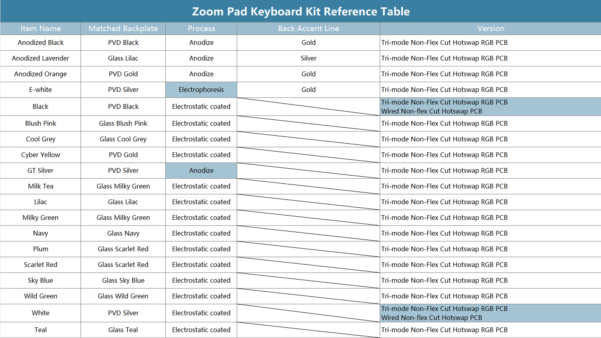 The table below shows which PCB and Backplate are included with each version of the ZoomPad. Additional information is also provided for select versions.